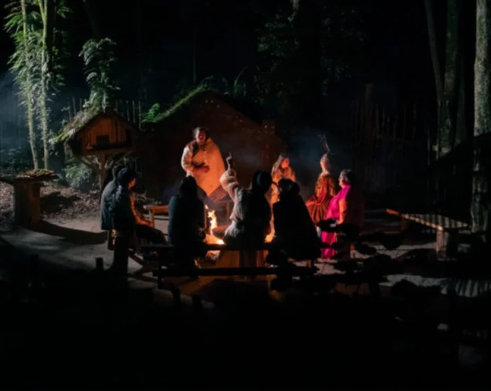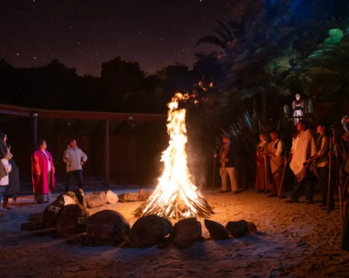 In einem natürlichen Amphitheater umgeben von turmhohen Tawa-Bäumen und loderndem Feuer erleben Sie einen mitreißenden Kapa Haka-Auftritt. Haka, Poi und Waiata (Gesänge) vermitteln die Geschichten und Traditionen der Maori und schaffen eine tiefgreifende Verbindung zu den kulturellen Wurzeln von Aotearoa (Neuseeland).