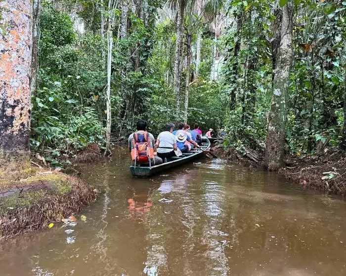 Sie werden vom Hotel abgeholt und zum Flughafen gefahren, von wo aus Sie nach Puerto Maldonado fliegen. langer Flug. Der Flug mit Aussicht auf die schneebedeckten Anden und den grünen Amazonas-Regenwald ist einfach unglaublich schön. Bei der Ankunft werden Sie von einem Repräsentanten der Lodge Corto Maltes Amazonia abgeholt, der Sie über den Fluss Madre de Dios in einer rund 40-minütigen Bootsfahrt zu Ihrer Lodge bringt.