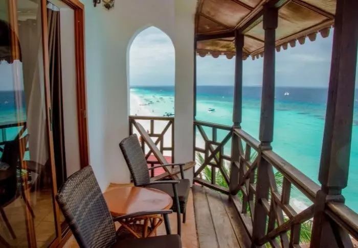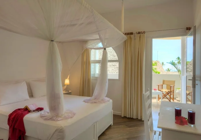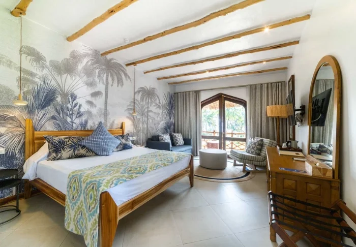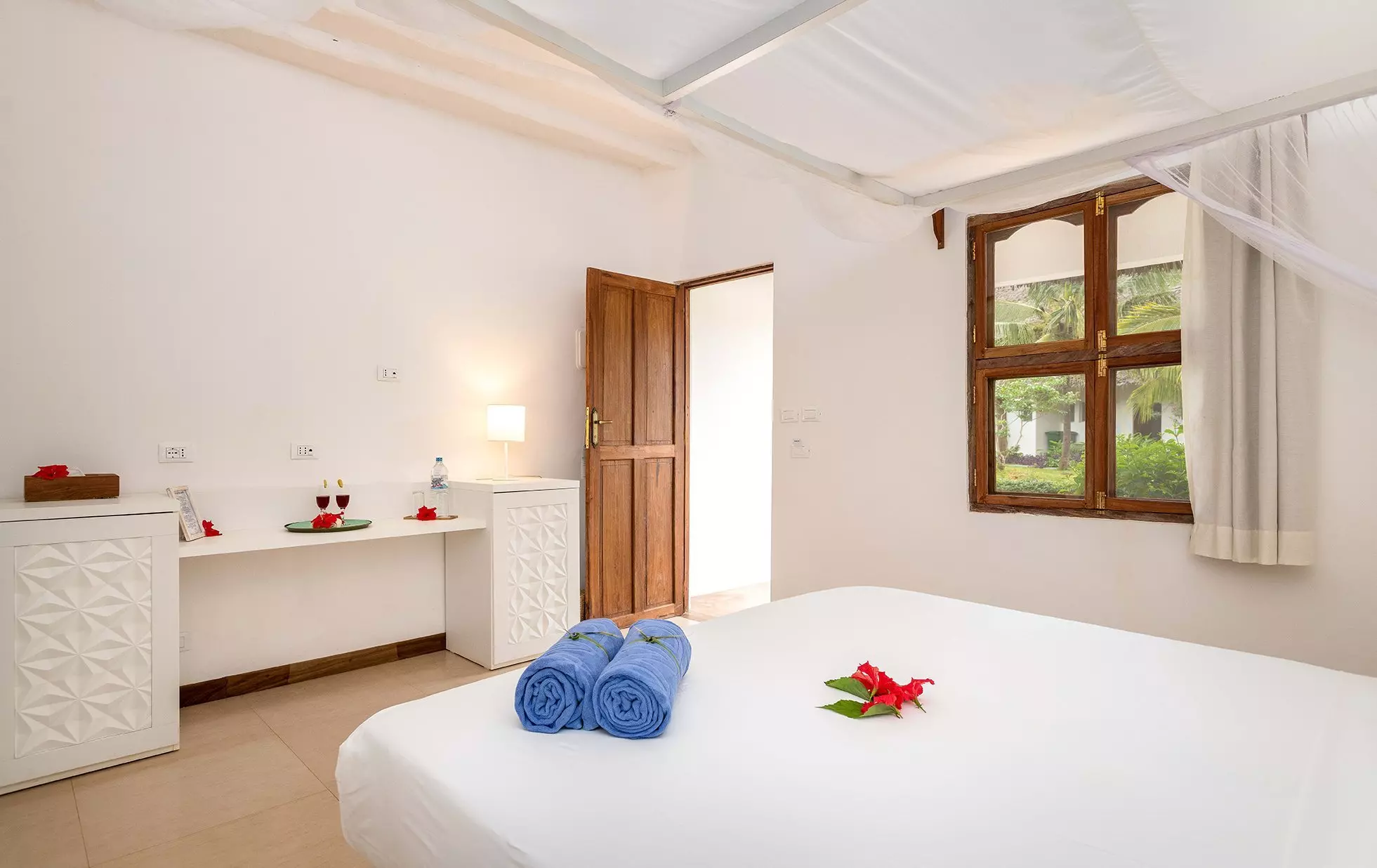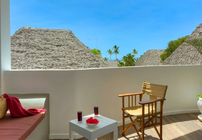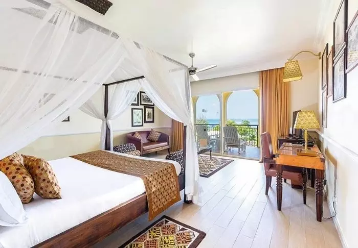Man sieht dem Hotel an, dass sich die Architekten von Sansibars afrikanischer und arabischer Geschichte inspirieren ließen. Die 45 m² großen Zimmer haben jeweils einen 12 m² großen Balkon oder eine Terrasse, von wo aus man eine herrliche Aussicht auf den Garten und den Indischen Ozean hat. Die Zimmer sind modern und mit leicht afrikanischem Touch und warmen Erdfarben eingerichtet. Alle Zimmer verfügen über ein Himmelbett mit Mückennetz, Klimaanlage, Deckenventilator, Telefon, TV-Gerät, WLAN, Minibar, Sicherheits-Box, CD/DVD-Abspieler sowie Zubereitungsmöglichkeit für Tee und Kaffee.