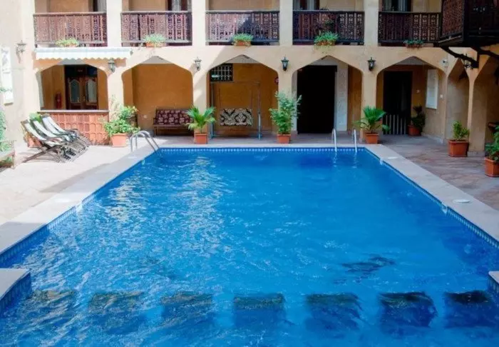 Das Hotel besteht aus einem alten, majestätischen Gebäude, das in arabischem Stil eingerichtet worden ist und insgesamt 29 Zimmer beherbergt. Die meisten Zimmer haben einen Balkon mit Aussicht über den Strand oder den Swimmingpool im Hof. Alle Zimmer haben Bad, Toilette, Aircondition, Kühlschrank, Telefon und Satellit-/Kabel-Fernseher. Ferner gibt es im Hotel Swimmingpool, Souvenir-Shop, Internetanschluss und Wäscherei.