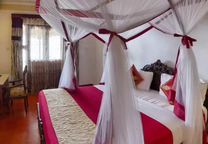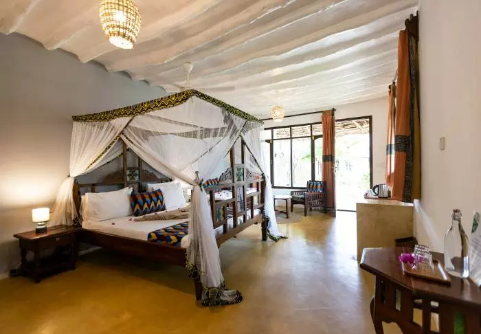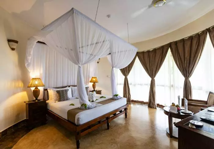 56 der Standardzimmer befinden sich in runden Hütten, die in echtem afrikanischem Stil mit Strohdächern erbaut worden sind. In jeder Hütte sind zwei Zimmer, aber jedes Zimmer kann von der gegenüberliegenden Seite der Hütte über einen separaten Eingang betreten werden. Es fühlt sich daher so an, als hätte man seine eigene Hütte. Alle Zimmer verfügen über eine eigene Terrasse, eine ansprechende Einrichtung und viel Platz. Sie sind nur wenige Gehminuten vom Pool und vom Strand entfernt.