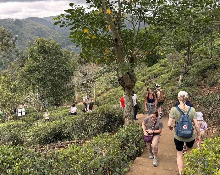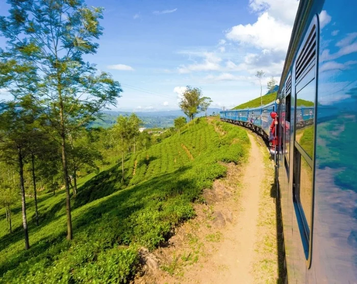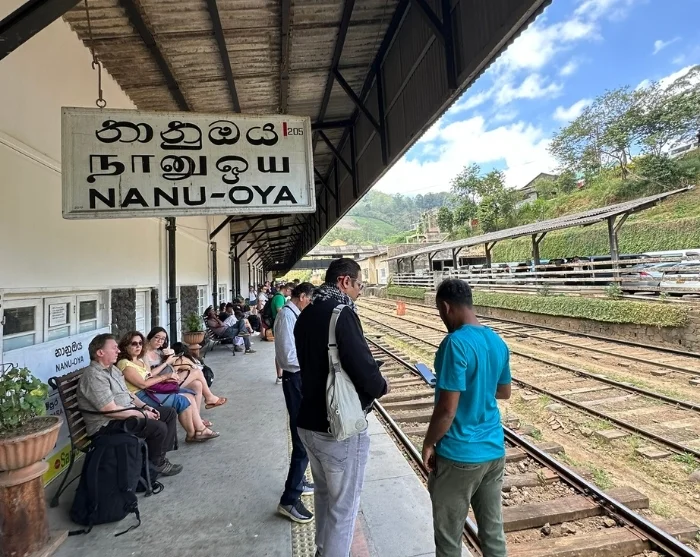 Bei der Ankunft in Nanu Oya steigen Sie in den klassischen Zug ein, der sich bald gemächlich durch Sri Lankas üppige Highlands windet. Machen Sie es sich bequem und genießen Sie Ihre mitgebrachten Snacks, während der Zug sich durch sanfte Kurven windet und Ausblicke auf lebendige grüne Teeplantagen, nebelige Bergspitzen und winzige Dörfer bietet, in denen Kinder fröhlich lächeln und winken.