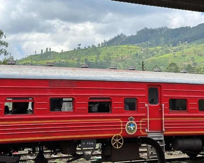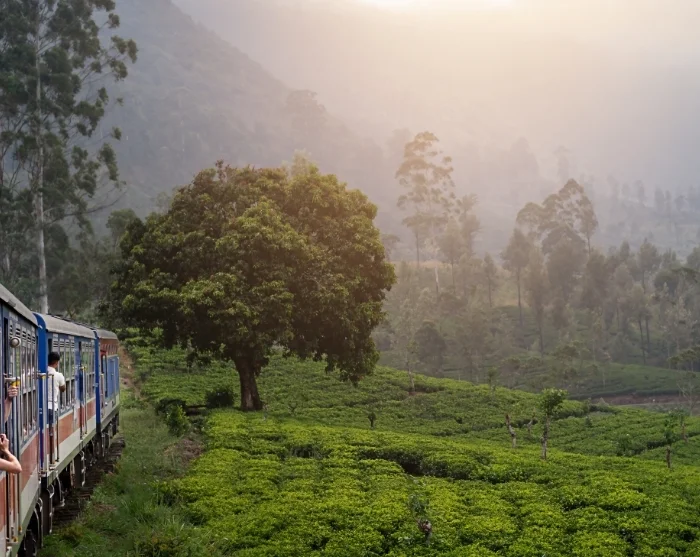 Sie gehen an Bord des klassischen Zuges, der sich schon bald durch das grüne Hochland Sri Lankas schlängelt. Machen Sie es sich gemütlich und genießen Sie Ihre mitgebrachten Snacks, während der Zug durch sanfte Kurven schnauft und eine sich langsam entfaltende Aussicht auf hellgrüne Teeplantagen, in Nebel eingehüllte Gipfel und kleine Dörfer freigibt, in denen fröhliche Kinder lachen und winken.