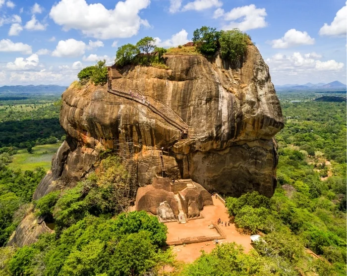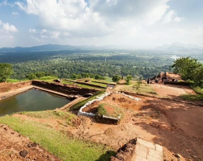 Auf dem ebenen Gipfel des Felsens erwartet Sie ein Erlebnis, das Sie so schnell nicht vergessen werden. Dort können Sie die einmalige Aussicht über die Ruinen des ehemaligen Königspalastes mit Burggraben, Wasseranlage und üppigen Gärten bewundern. Am Horizont erstreckt sich ein grünes Meer aus Dschungel, Bergen und Dörfern und in der Ferne erahnt man den Pidurangala-Felsen.