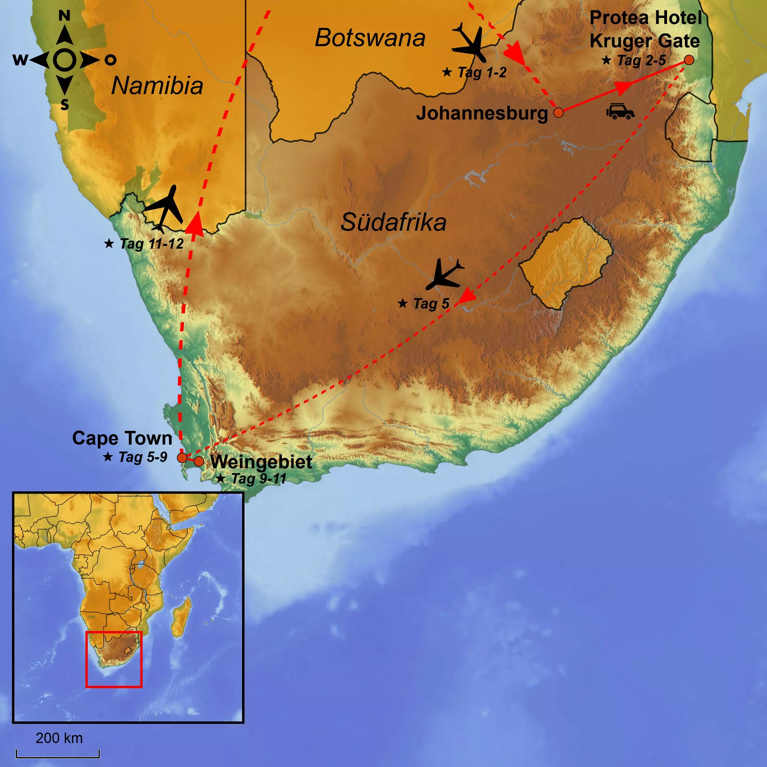 Heute ist es an der Zeit, sich von Südafrika zu verabschieden. Sie werden von Ihrem Hotel abgeholt und zum Flughafen gefahren, von wo aus Sie mit Zwischenlandung(en) wieder zurück fliegen.