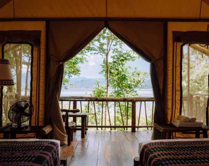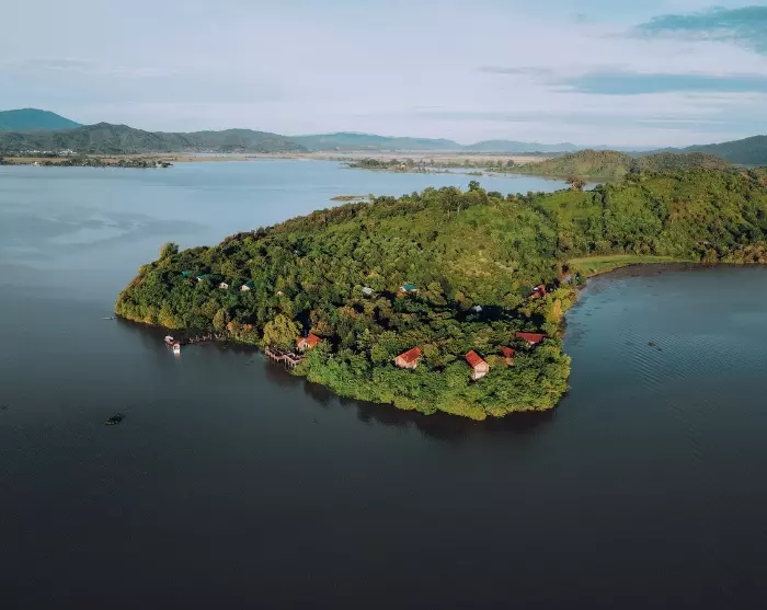 Lak Tented Camp liegt am Ufer des spiegelblanken Sees Lak Lake in Vietnam. Das Camp inmitten grüner Berge, dichter Wälder und traditioneller Dörfer wurde mit Fokus auf verantwortungsbewussten Tourismus und Nachhaltigkeit angelegt.