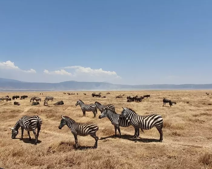 Von ganz oben am Krater schlängelt sich ein Weg 600 Meter an der Innenseite des erloschenen Vulkankraters hinunter in den 260 km² großen fruchtbaren Kraterboden. Im fruchtbaren Krater finden Sie völlig unterschiedliche Biotope – Savanne, Sümpfe, Seen, kleine Flüsse, Akazienwäldchen und sogar einen Salzwassersee.