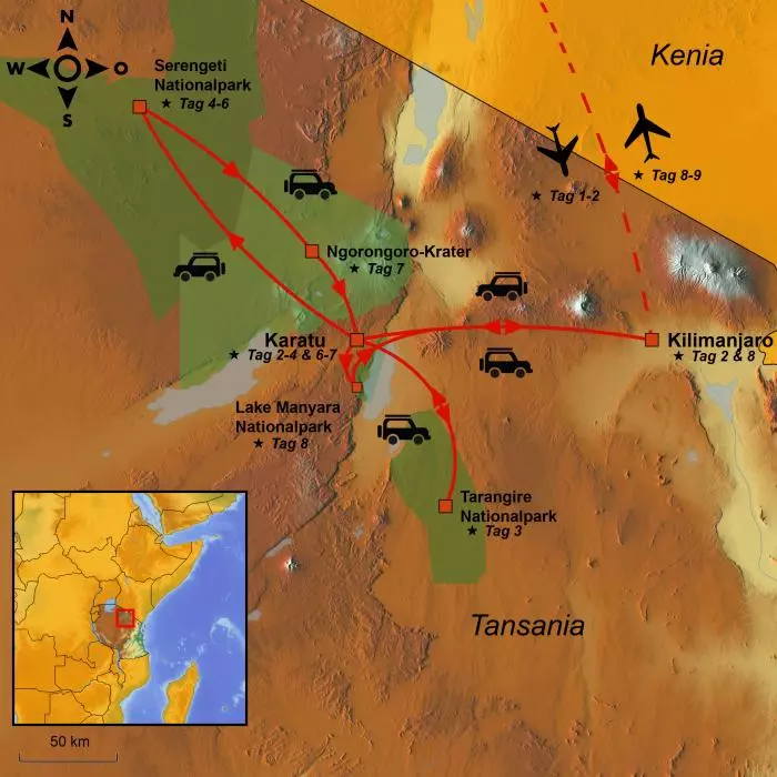 | Day 8 | Lake Manyara ca. 25 km und zum Kilimanjaro Flughafen | 195 |