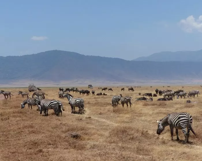 Von der Serengeti geht es weiter zum Ngorongoro-Krater. Die Fahrt erfolgt mit dem Auto, sodass es sich beinahe wie ein langer Game Drive anfühlt.