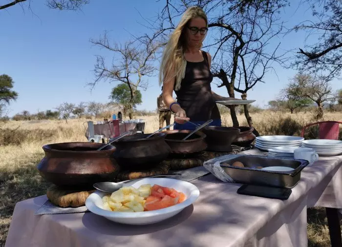 Eigentlich kaum zu glauben, da man in einem Safariauto oft viele Stunden lang sitzt. Trotzdem wird man in einem Safariauto wirklich hungrig! Vielleicht spielt die frische Luft dabei eine Rolle, vielleicht auch die (manchmal) holprigen Wege, oder vielleicht ist das Adrenalin schuld daran, dass man so hungrig wird. Es gibt daher in diesem Fall nichts Besseres als ein sättigendes Mittagessen, das mitten auf den weitläufigen Ebenen der Serengeti serviert wird.