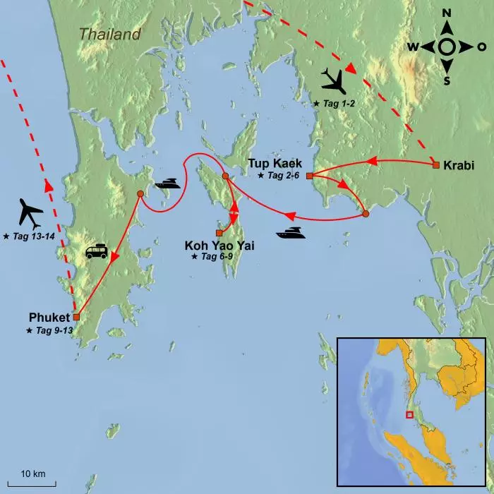 Ihre Reise beginnt in Krabi. Übernachten können Sie in der Nähe von Tup Kaek oder in Ao Nang. Hier warten Entspannung und ein ereignisreiches Inselhopping zu den schönsten, absolut einzigartigen Inseln und Stränden der Andamanensee auf Sie, beispielsweise Phra Nang Beach – einer der schönsten Strände Thailands.