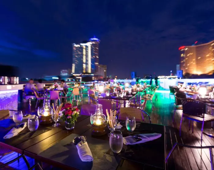 Nachdem Sie ein Willkommensgetränk angeboten bekommen haben, können Sie sich entspannt zurücklehnen und die spektakuläre Aussicht auf den Grand Palace, den Morgengrauentempel Wat Arun usw. genießen, während die Sonne langsam über der Hauptstadt untergeht.