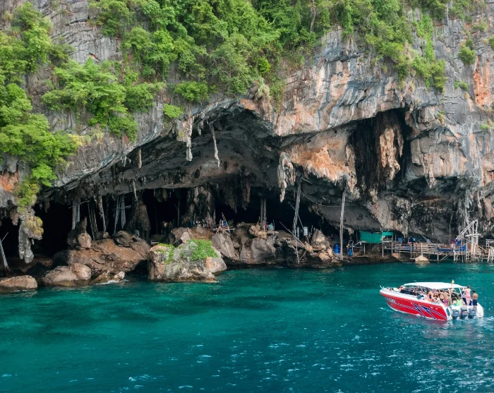 Anschließend geht die Fahrt weiter zur Pileh-Lagune – einem der atemberaubendsten Orte Thailands. Die Lagune wird von imposanten Kalksteinfelsen umschlossen, die steil aus dem klaren, türkisfarbenen Wasser emporragen. In der Lagune schaukeln traditionelle Longtail-Boote sanft im Wasser – eine Szenerie wie aus dem Bilderbuch. Springen Sie direkt vom Boot ins erfrischende Wasser und genießen Sie die magische Atmosphäre dieser Umgebung.