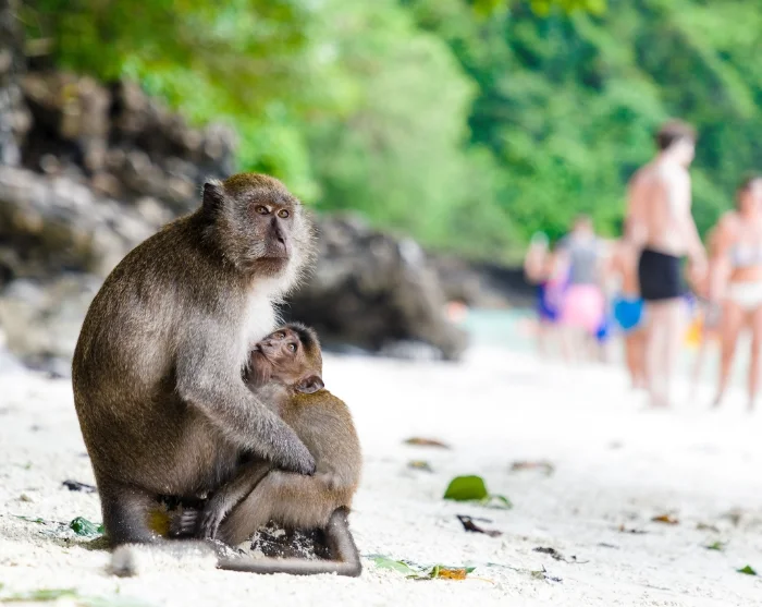 Die Reise führt weiter vorbei an der Viking Cave bis zum Monkey Beach (Ao Ling) an der Westküste von Phi Phi Don, der größten Insel der Phi Phi-Inseln. Der Strand verdankt seinen Namen den wilden Affen, die sich zwischen dem puderzuckerweißen Sand niedergelassen haben. Die Affen können recht frech sein und versuchen manchmal, nach Ihren Sachen zu greifen. Wir empfehlen Ihnen deshalb, Wertsachen entweder auf dem Boot zu lassen oder gut zu verstauen. Auf Phi Phi Don haben Sie die Wahl, zum berühmten Aussichtspunkt zu wandern, durch das Dorf von Phi Phi Don zu schlendern oder am Strand zu entspannen.