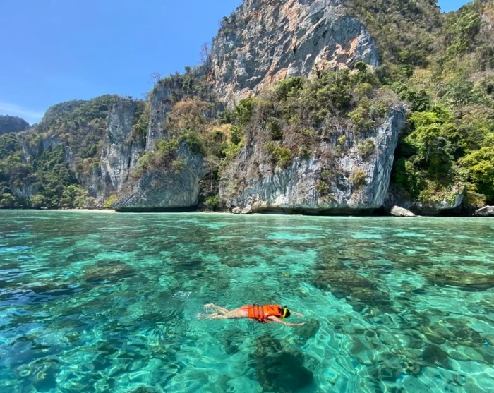 Danach erwartet Sie ein malerischer Schnorchelstopp vor Phi Phi Don, wo Sie zwischen bunten Fischen und Korallen schwimmen können – die komplette Ausrüstung ist selbstverständlich inklusive.