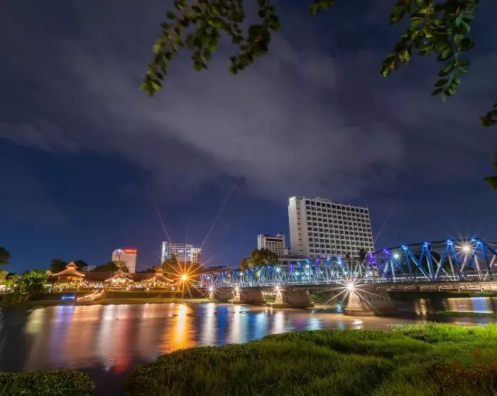 Dort steigen Sie in einen Songthaew, einen umgebauten Pickup, der Sie zu einem regionalen Blumenmarkt fährt. Schlendern Sie durch die vielen Stände mit bunten Blumen und regionalen Delikatessen. Sie überqueren den Fluss Ping und können den Tempel Wat Gate Garam im Abendlicht bewundern.