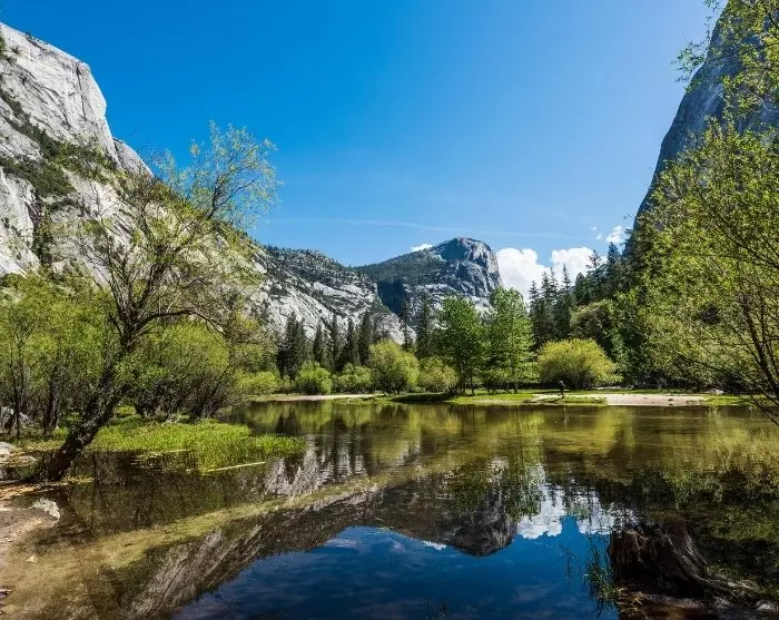 Im Park werden Sie von spektakulären Wasserfällen begrüßt, die von dramatischen Klippen herabstürzen. Yosemite hat Wanderrouten für jeden Schwierigkeitsgrad und jedes Alter zu bieten, und Sie müssen nicht weit gehen, um beliebte Naturattraktionen zu sehen. Ein guter Ausgangspunkt ist der Lower Yosemite Fall, der leicht zugänglich ist, oder der Mirror Lake, der die umliegenden Berge auf seiner Wasseroberfläche spiegelt. Sie können gerne im Besucherzentrum nach passenden Routen fragen.