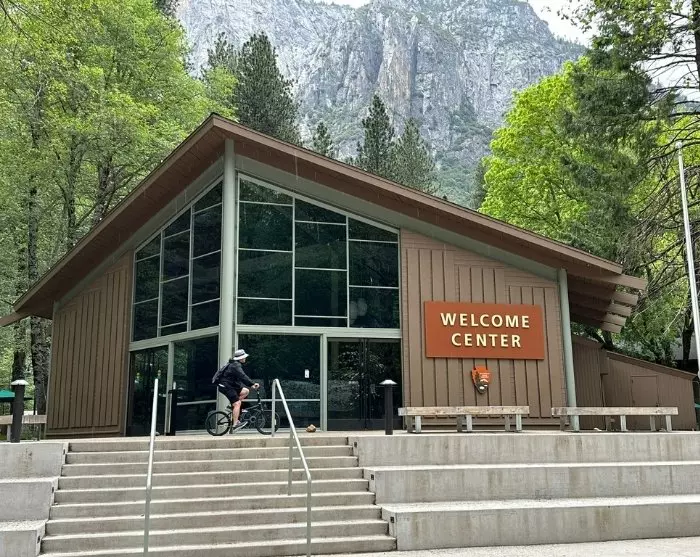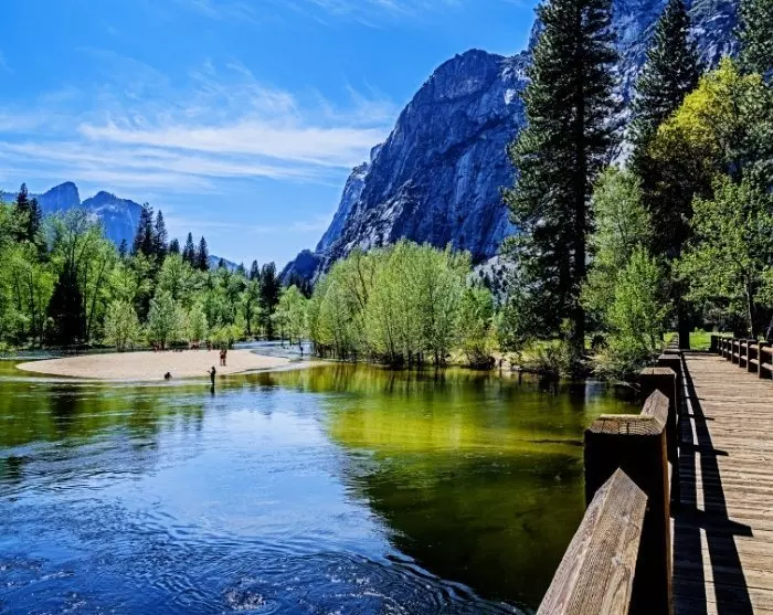 Im Yosemite Valley ist es auch möglich, ein Fahrrad zu mieten. Sie können die befestigten Radwege nutzen und von einem Wasserfall zum nächsten zu fahren, während Sie einfach den Blick auf die riesigen Felswände und Bäume um Sie herum genießen. Ein guter Platz für einen Snack ist der kleine Sandabschnitt im Picknickbereich der Swinging Bridge, wo Sie einen Blick auf den Wasserfall Yosemite Falls haben.