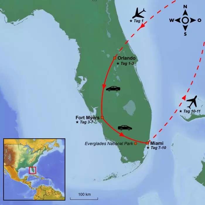Heute ist der Tag gekommen, an dem Sie in den südlichsten Bundesstaat der kontinentalen USA reisen, nämlich nach Florida. Sie fliegen von Ihrem gewählten Flughafen nach Orlando, das zentral im nördlichen Teil Floridas liegt.