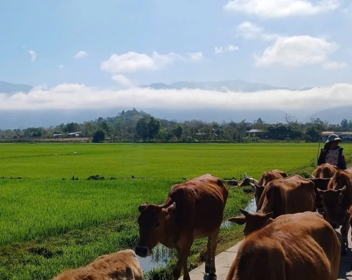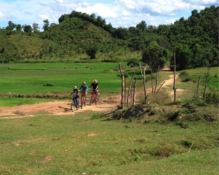 Nach dem Frühstück radeln Sie nach Yang Tao, einem etwa 12 km entfernten Dorf. Ihre Route führt Sie durch üppig grüne Reisfelder, in denen Sie unterwegs vielleicht Büffel- und Rinderherden beobachten können. Im Dorf erleben Sie die kunstvolle Herstellung der traditionellen M’nong-Keramik und besuchen Kakaoplantagen. Dort erwartet Sie eine besondere Kostprobe: der einzigartige, vergorene Kakaowein.
