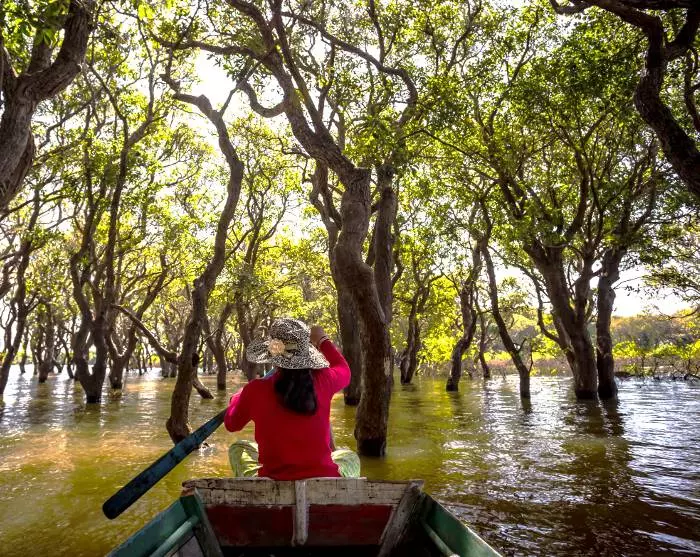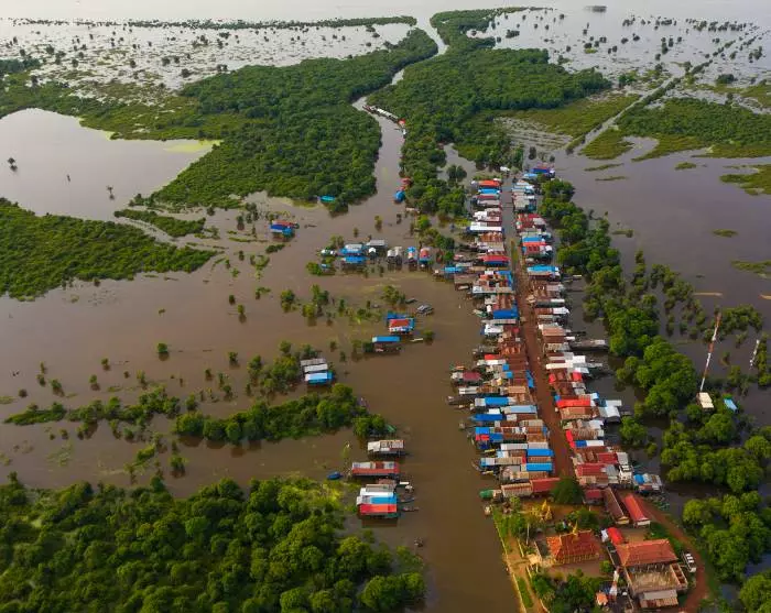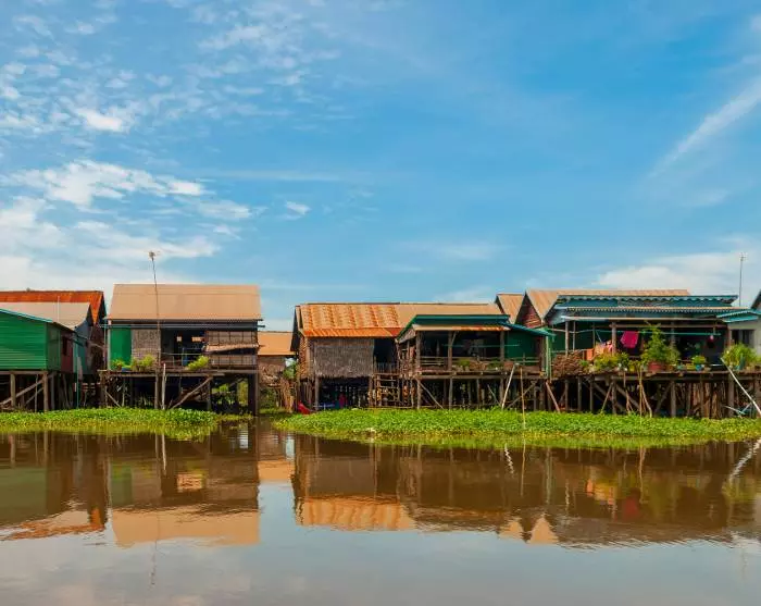 Sie kommen an den Ufern von Tonlé Sap an und gehen an Bord eines Bootes, das Sie zu einem der schwimmenden Dörfer des Sees bringt. Hier können Sie aus nächster Nähe sehen, wie sich das Leben für viele der Familien entwickelt, die vor allem durch Fischen leben. Die Familien leben entlang des Seeufers in bunten Häusern, die auf langen Stelzen stehen, damit sie während der Regenzeit (August bis Anfang Februar) mit den hohen Wasserständen umgehen können, wenn die engen Gassen des Dorfes in kleine Kanäle umgewandelt werden. In der Trockenzeit (Mitte Februar bis Juli) mit niedrigeren Wasserständen sind die hohen Stelzen leicht zu sehen.