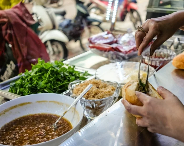 Zum Mittagessen können Sie auf die Jagd nach der berühmten Streetfood von Hanoi gehen. Probieren Sie eine dampfende Schale Pho, genießen Sie den Duft gegrillter Bun Cha oder nehmen Sie ein krosses Banh Mi mit.