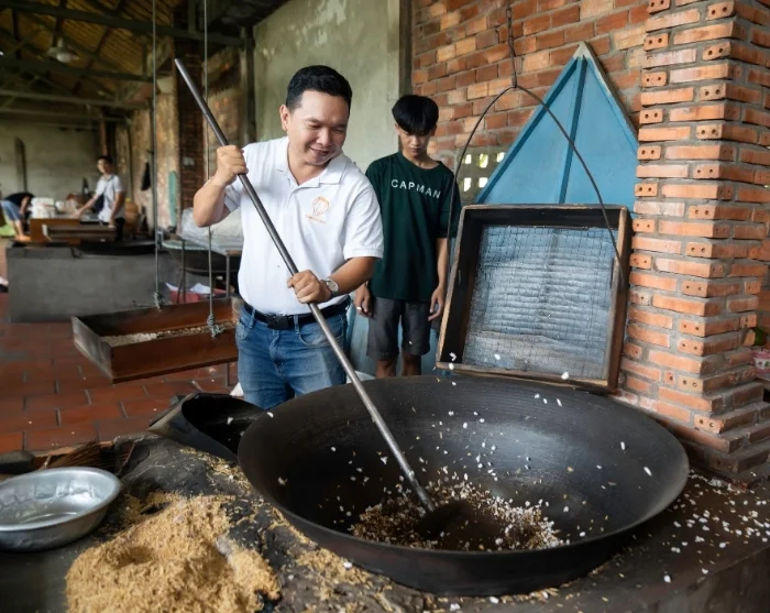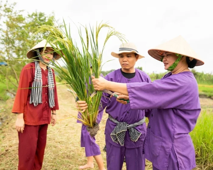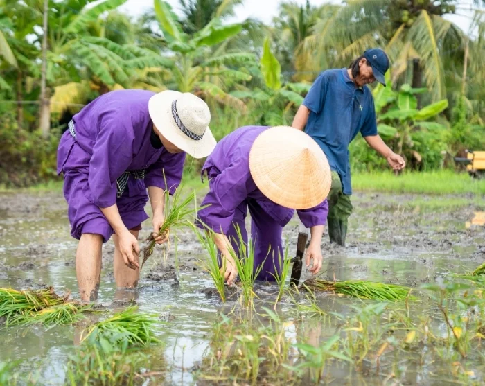 Anschließend geht es weiter zu unserem soziales Nachhaltigkeitsprojekt in Vinh Long, das von einem unserer Kooperationspartner vor Ort ins Leben gerufen wurde. Sie schlendern durch das Dorf, während Ihr Guide Ihnen etwas über das Projekt erzählt. Im Dorf können Sie sich auch selbst in die traditionelle Landwirtschaft einbringen. Zusammen mit den lokalen Bauern messen Sie Ihre Kräfte beim Reisanbau und, je nach Jahreszeit, pflanzen Sie entweder die zarten Reispflänzchen oder helfen bei der Ernte. Das ist lehrreich und erdverbunden zugleich und vermittelt Ihnen einen einmaligen Einblick in den Alltag der ländlichen Gebiete Vietnams, wie auch in die mit nachhaltiger Landwirtschaft verbundene Arbeit. Als Teilnehmer an der Tour unterstützen Sie die Familien in Vinh Long, da ein Prozentsatz des Reisepreises direkt in das Projekt einfließt, über das Sie hier mehr erfahren können.