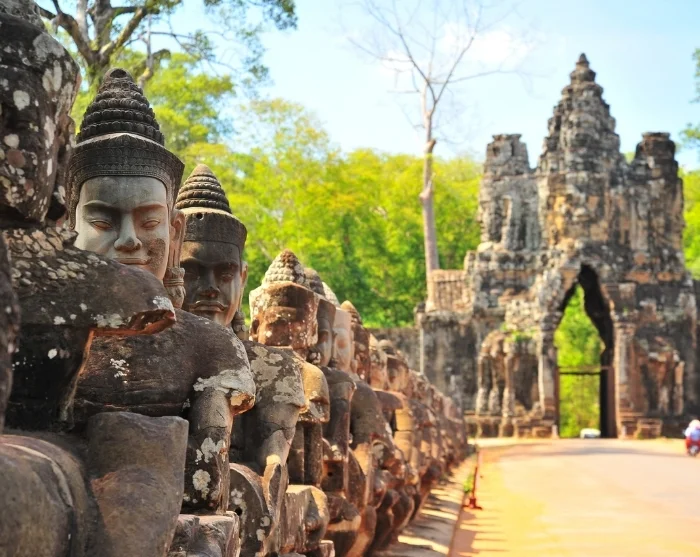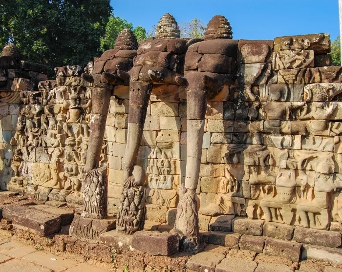Auch die Terrasse der Elefanten mit zahlreichen in Stein gehauenen Elefantenköpfen, die eine Mauer bilden, müssen Sie erleben. Von dort konnte König Jayavarman seinerzeit sein Heer überblicken. In unmittelbarer Nähe liegt die Terrasse der aussätzigen Könige mit einer Statue von Yama, dem Gott des Todes in der hinduistischen Mythologie.
