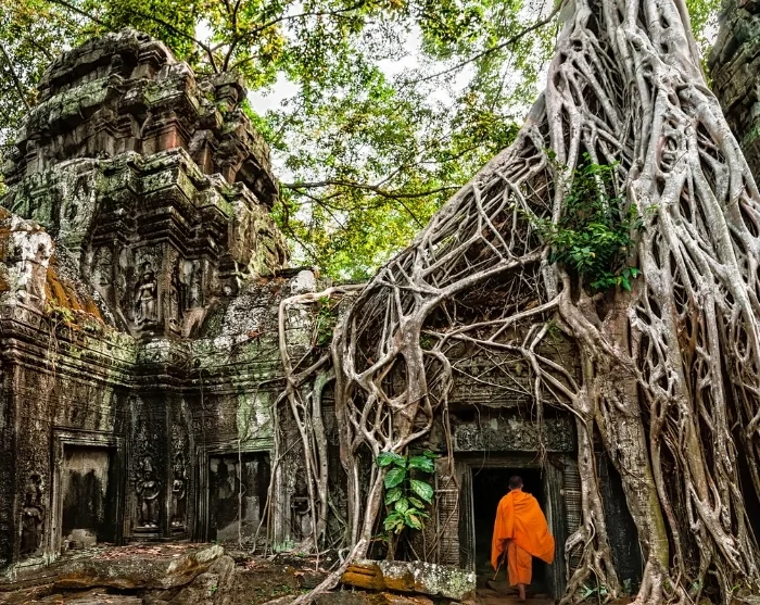 Nach kurzer Fahrt erreichen Sie Ta Prohm, das sich von den anderen unterscheidet. Schöne, große Bäume haben mitten in den Ruinen Wurzeln geschlagen, so dass Natur und Stein fast zu einem faszinierenden Ganzen zusammengewachsen sind.