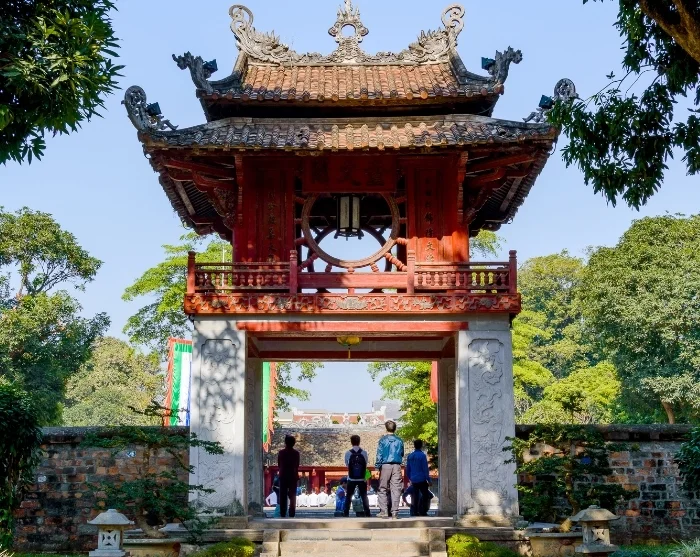 Anschließend werden Sie zum Tempel der Literatur gefahren, einer friedlichen Anlage, die Schüler des chinesischen Philosophen Konfuzius im 12. Jahrhundert erbaut haben. Mit seinen fast 1000 Jahren ist der Tempel ein seltenes und gut erhaltenes Beispiel für traditionelle vietnamesische Architektur mit Säulengängen, Teichen und grünen Innenhöfen, wo junge Studierende immer noch für Erfolg bei den Prüfungen beten.