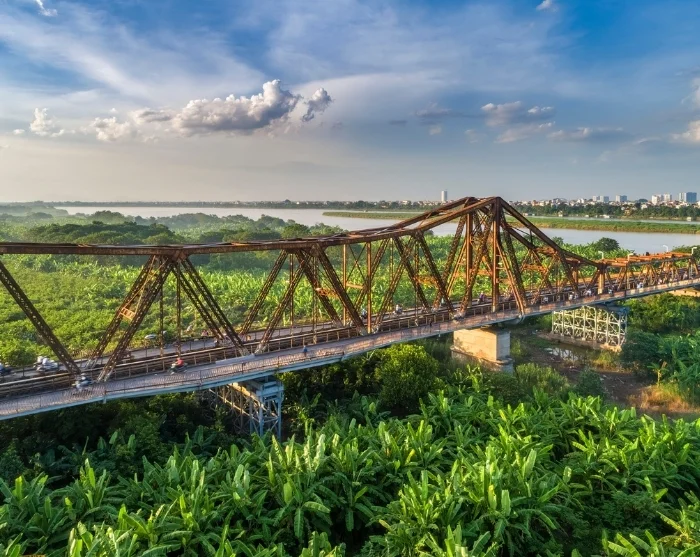 Nach einer interessanten Tour mit dem Cyclo besichtigen Sie die historische Long Bien-Brücke aus den Anfängen des 20. Jahrhunderts, die ein ikonisches Wahrzeichen aus der französischen Kolonialzeit darstellt. Die während des Vietnamkriegs stark beschädigte, charakteristische Eisenbrücke führt über den Roten Fluss und ist heute ein starkes Symbol für die Widerstandskraft Hanois. Die Brücke, ein stimmungsvolles Erlebnis, ist der Eisenbahn, Radfahrern und Fußgängern vorbehalten. Die Einwohner der Stadt nutzen die Brücke mit dem Fahrrad auf dem Weg zur Arbeit oder verkaufen Obst entlang der Schienen – Sie können die Aussicht auf die kleinen, grünen Inseln im Fluss mit bestellten Feldern mitten in der Großstadt genießen – ein beliebtes Fotomotiv der Fotografen und Reisenden, die Hanois Seele einfangen wollen.