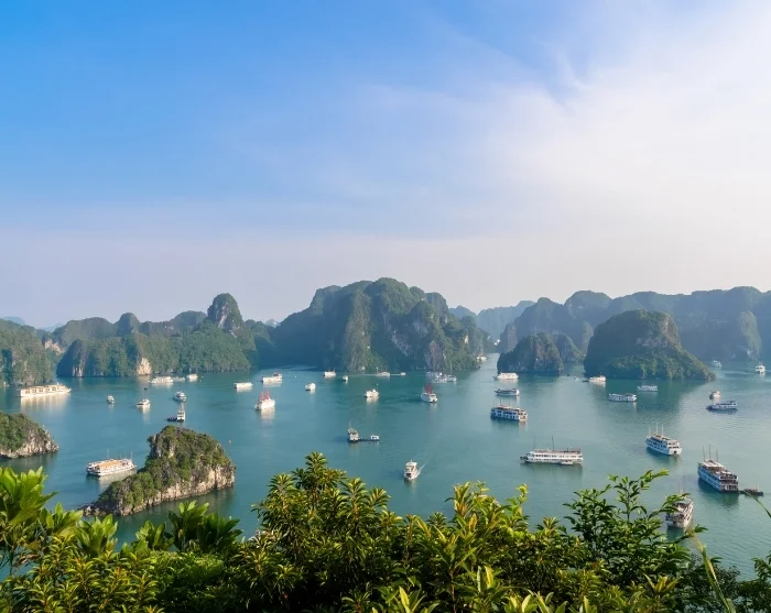 Die Halong-Bucht ist eines der charakteristischsten Naturgebiete Vietnams. Hier ragen hunderte grün bewachsene Kalksteinfelsen senkrecht aus dem Meer, das im Laufe des Jahres die Farbe von tiefblau zu jadegrün wechselt. Auf der größten Insel, Cat Ba, gibt es einige Dörfer, auf manchen der kleineren Inseln kleinere Fischerdörfer. Für Touristen ist die Halong-Bucht vorwiegend ein wundervolles erstklassiges Naturgebiet, während sie für Vietnamesen mit Legenden um Drachen und Drama verbunden ist. Die Bucht erstreckt sich über ca. 1.500 km² und wurde 1994 in das UNESCO Welterbe aufgenommen.