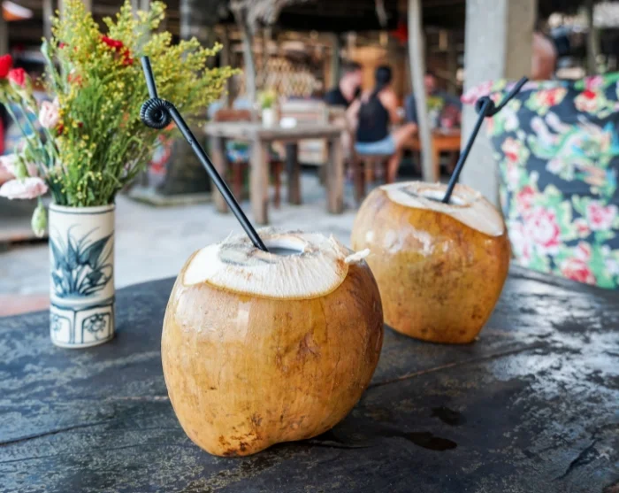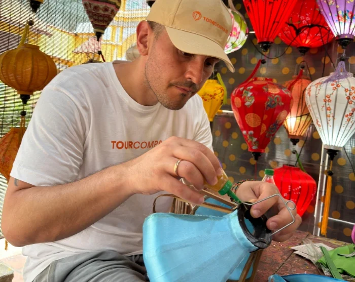 Eine frische Kokosnuss stillt Ihren Durst, bevor Sie zum Ha Linh-Laternen-Workshop weiterfahren. Hier erwartet Sie eine kreative Aktivität: Sie gestalten Ihre eigene wunderschöne Laterne, die Sie natürlich als Souvenir mit nach Hause nehmen dürfen.