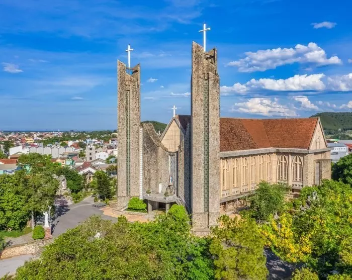 Die Reise führt weiter zur Phu Cam-Kathedrale, einer herausragenden katholischen Kirche, die für ihre beeindruckende Architektur bekannt ist, die modernes Design mit traditionellen Elementen verbindet. Auf einer Anhöhe mit Blick auf Hue erbaut, präsentiert die Phu Cam-Kathedrale eine prächtige Fassade mit zwei himmelstrebenden Türmen. Die Kathedrale ist ein zentraler Treffpunkt für die katholische Gemeinschaft in Hue und ein wichtiges Symbol für die christliche Präsenz in der Region.