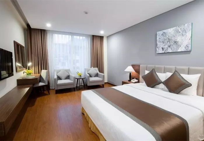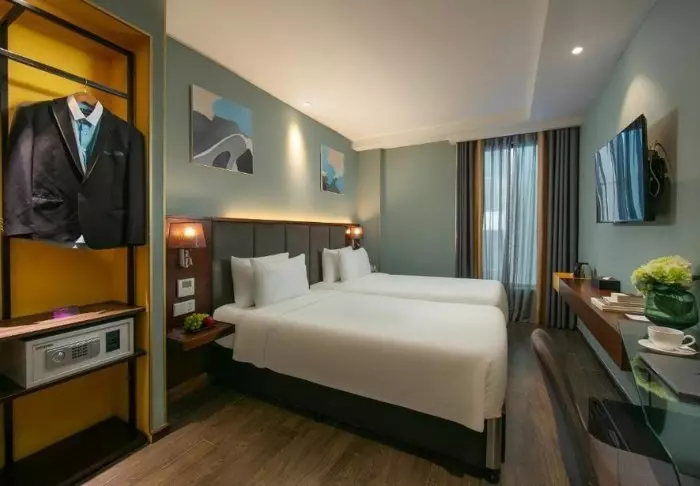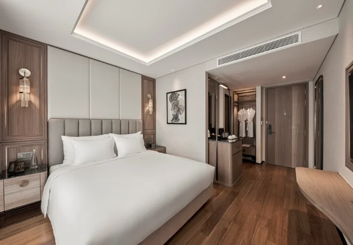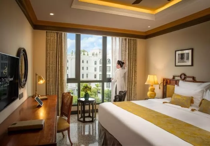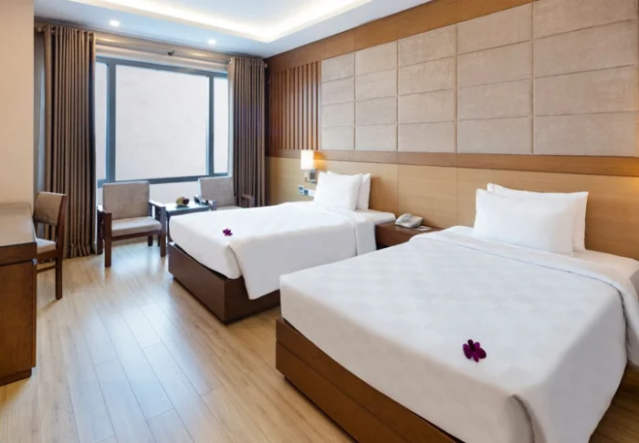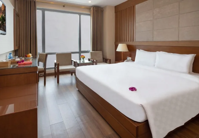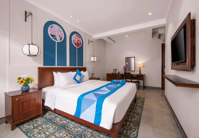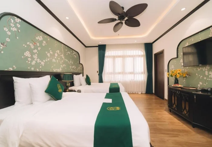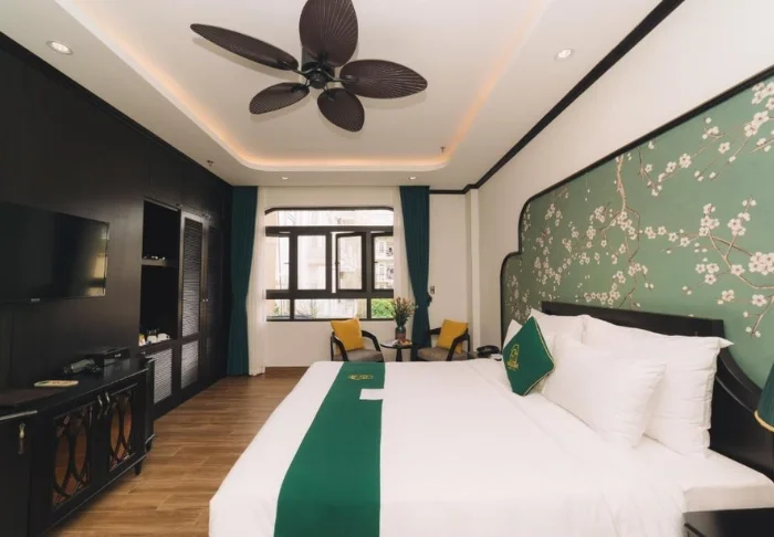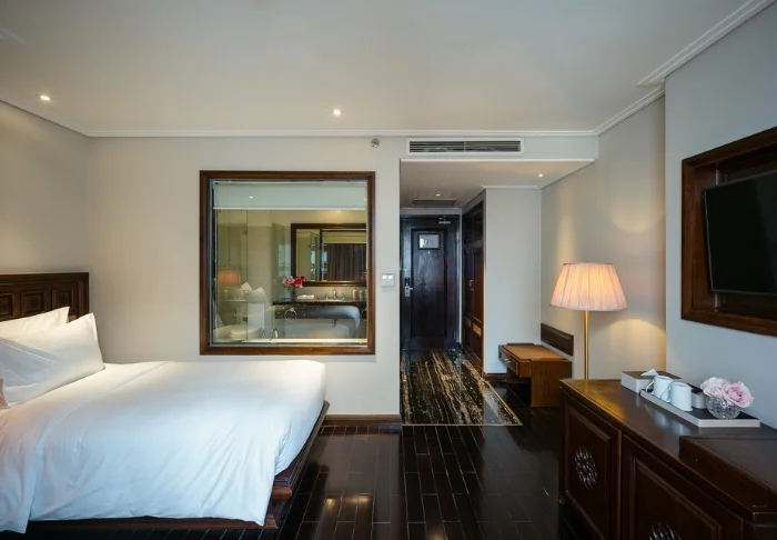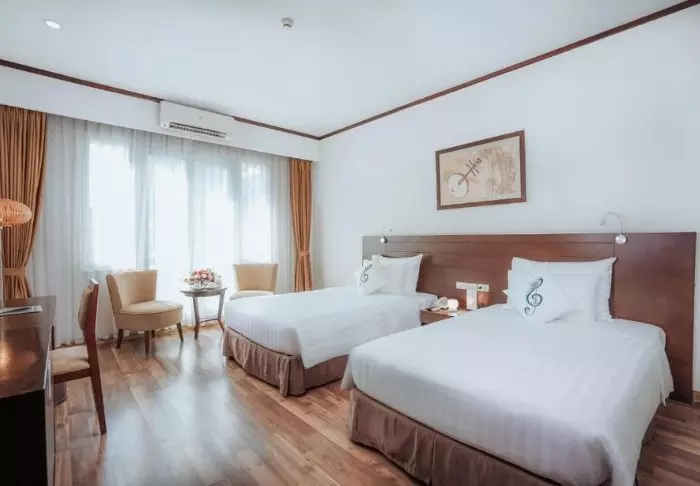 Prinzipiell wohnen Sie in einem Superior-Zimmer mit modernem Komfort und einem Hauch vietnamesischer Eleganz. Durch die großen Fenster der Zimmer fällt viel Tageslicht ein, Holzelemente und klassische Möbel sorgen für eine warme und einladende Atmosphäre. Bemerkenswert sind die Wandpaneele mit blühenden Kirschzweigen, die für einen regionalen und künstlerischen Touch sorgen. Alle Zimmer sind mit einem Doppelbett oder zwei Einzelbetten, Kühlschrank, TV, Safe, Wasserkocher, Klimatisierung und eigenem Bad mit Toilettenartikeln und Föhn ausgestattet. Die durchdachten Einzelheiten sorgen für einen ruhigen Ausgangspunkt, an dem Sie sich nach den Erlebnissen des Tages gut erholen können.