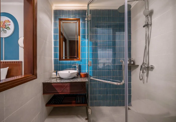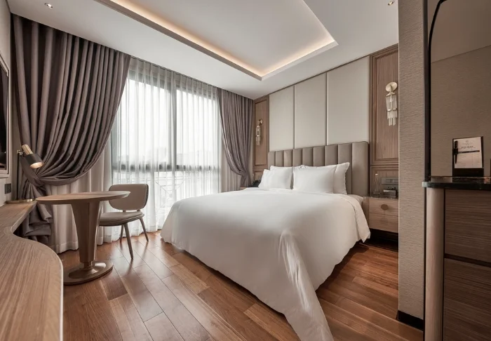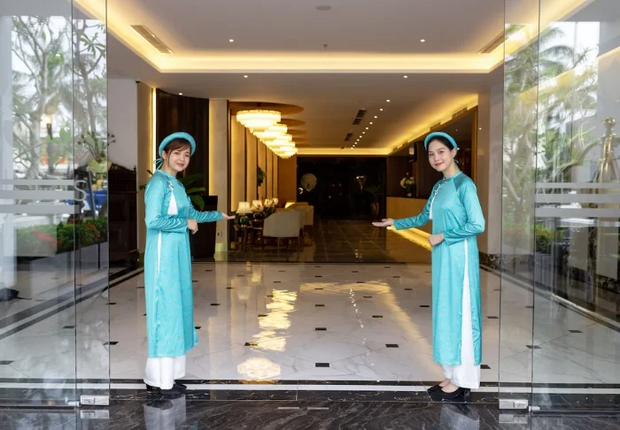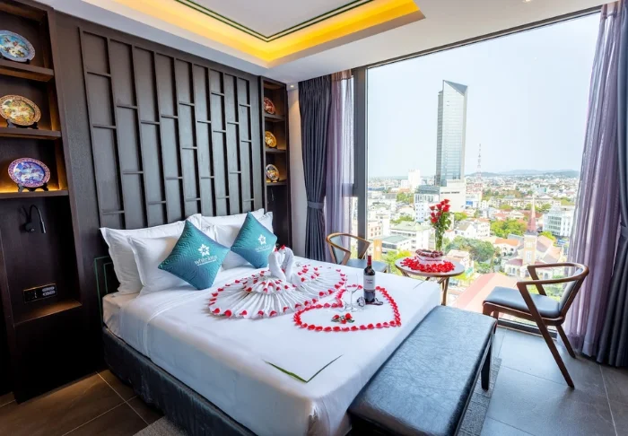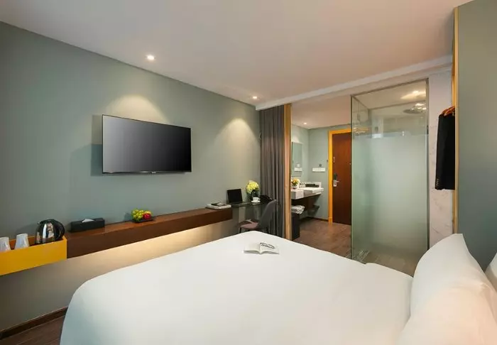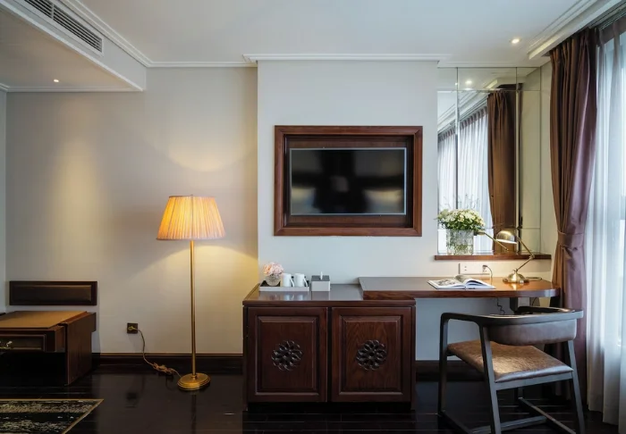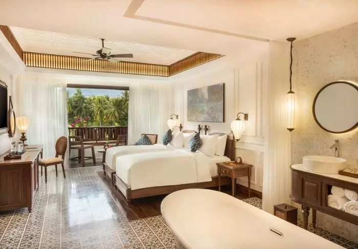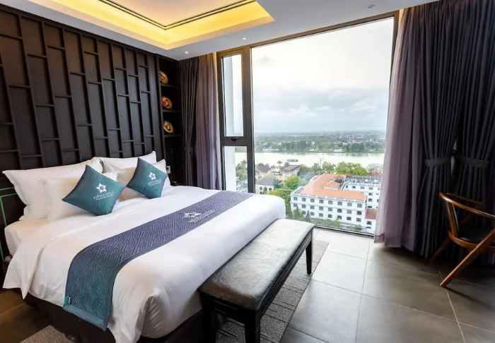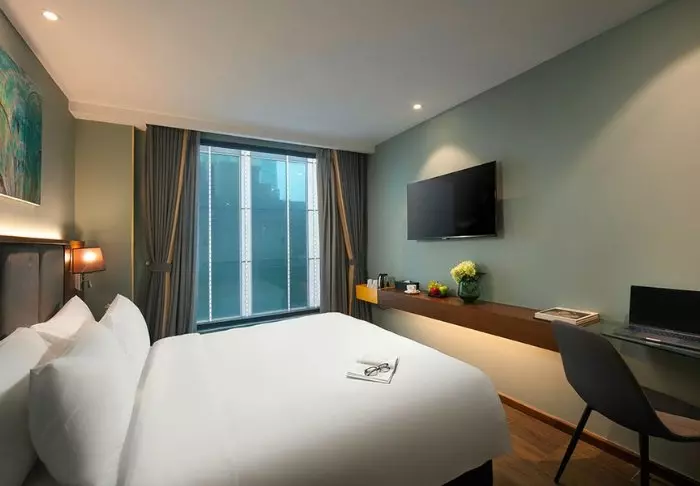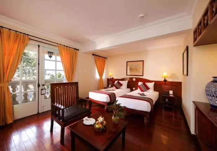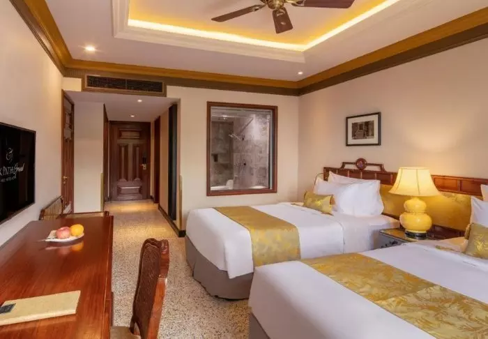 Prinzipiell wohnen Sie in einem Superior-Zimmer mit modernem Komfort und einem Hauch vietnamesischer Eleganz. Durch die großen Fenster der Zimmer fällt viel Tageslicht ein, Holzelemente und klassische Möbel sorgen für eine warme und einladende Atmosphäre. Bemerkenswert sind die Wandpaneele mit blühenden Kirschzweigen, die für einen regionalen und künstlerischen Touch sorgen. Alle Zimmer sind mit einem Doppelbett oder zwei Einzelbetten, Kühlschrank, TV, Safe, Wasserkocher, Klimatisierung und eigenem Bad mit Toilettenartikeln und Föhn ausgestattet. Die durchdachten Einzelheiten sorgen für einen ruhigen Ausgangspunkt, an dem Sie sich nach den Erlebnissen des Tages gut erholen können.