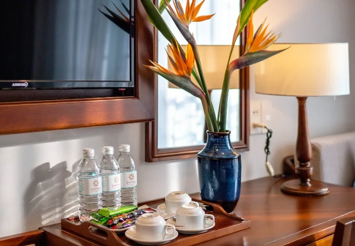 Standardmäßig sind Sie in einem Deluxe-Zimmer mit großen Fenstern und warmer Einrichtung in dunklem Holz, gedämpften Farben und weichen Stoffen untergebracht. Das Zimmer ist mit Doppelbett oder zwei Einzelbetten, eigenem Badezimmer mit Dusche, Toilettenartikeln und Föhn ausgestattet. Außerdem verfügt es über eine Klimaanlage, ein Safe, WLAN, TV, Wasserkocher und Mineralwasser in Flaschen. Die Minibar ist gefüllt und im Preis enthalten.