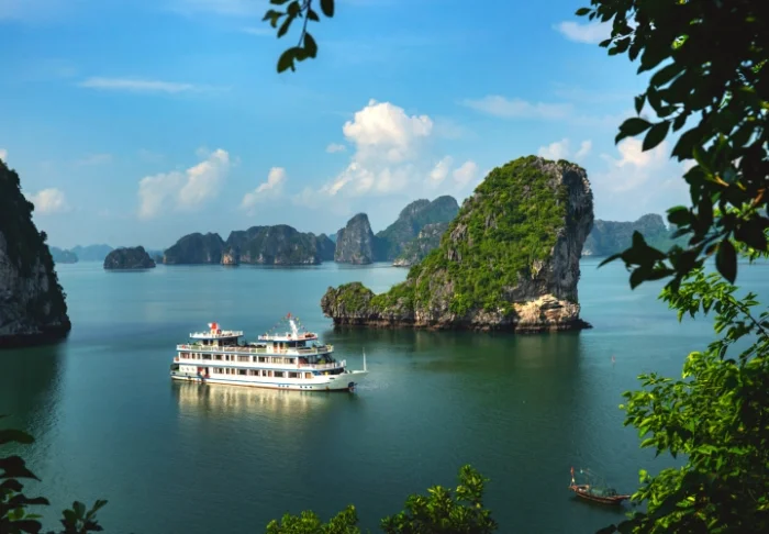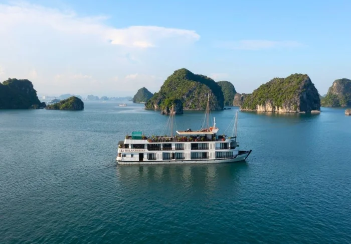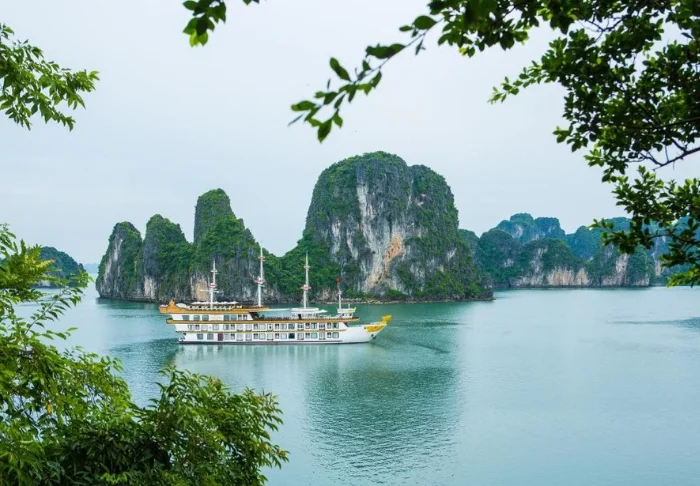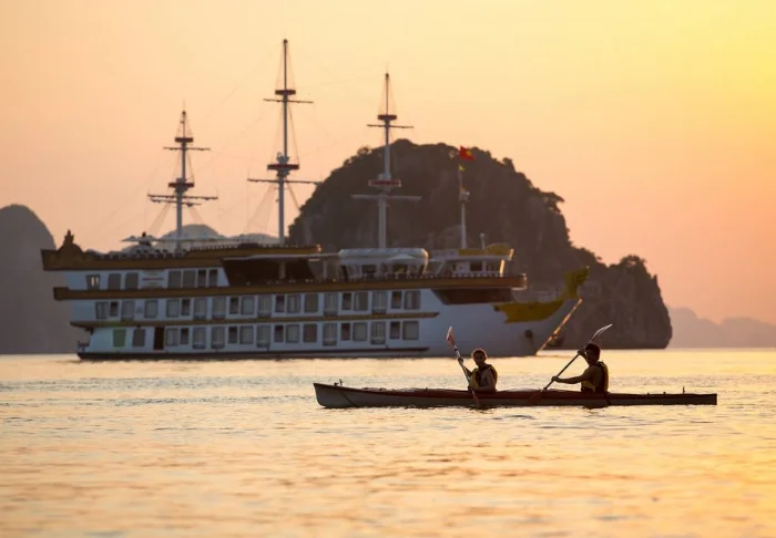 An Bord erwarten Sie ein Sonnendeck und ein Restaurant, in dem bei beeindruckender Kulisse frisch gefangener Fisch und vietnamesische Spezialitäten serviert werden, während das Schiff langsam durch die atemberaubende Landschaft gleitet. Tagsüber legt das Boot an einsamen Inseln und kleinen Fischerdörfern an. Sie können an Kajak-Ausflügen teilnehmen, Höhlen erkunden oder direkt vom Heck aus ins Wasser springen. Die Abende an Bord sind von Ruhe, Stille und einem funkelnden Sternenhimmel geprägt, vielleicht mit einem kühlen Getränk auf dem Deck.