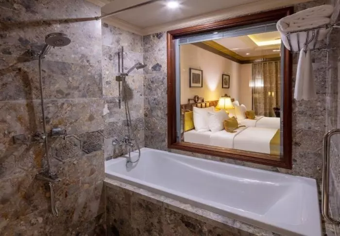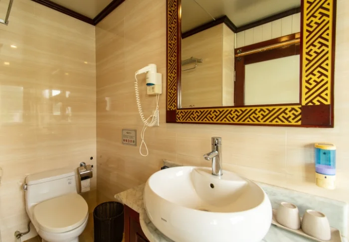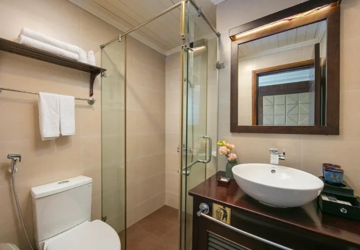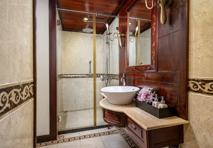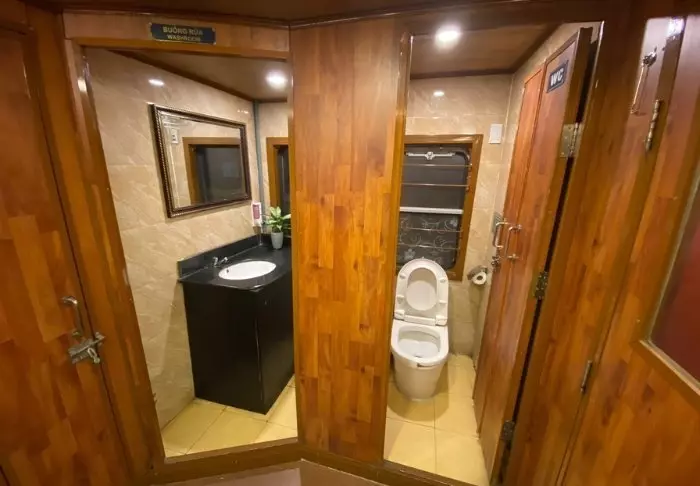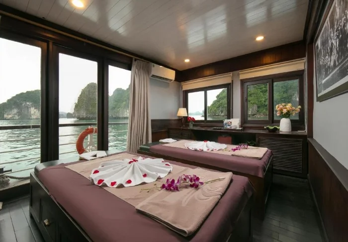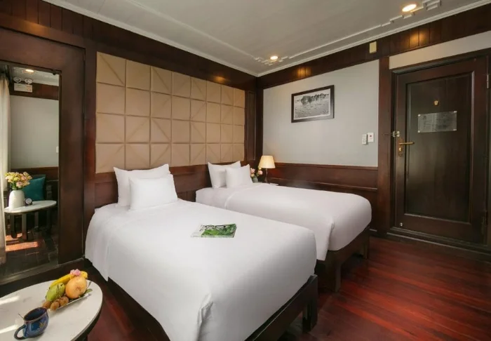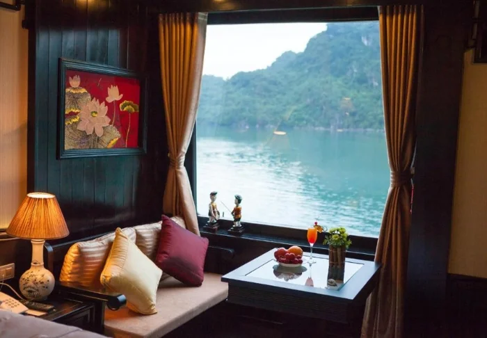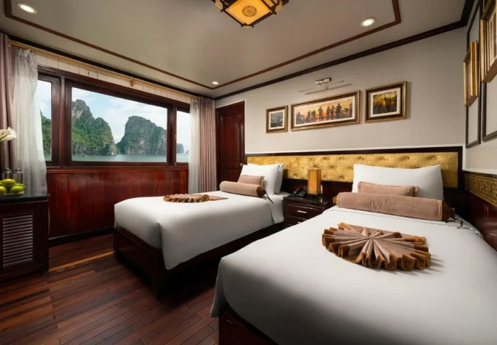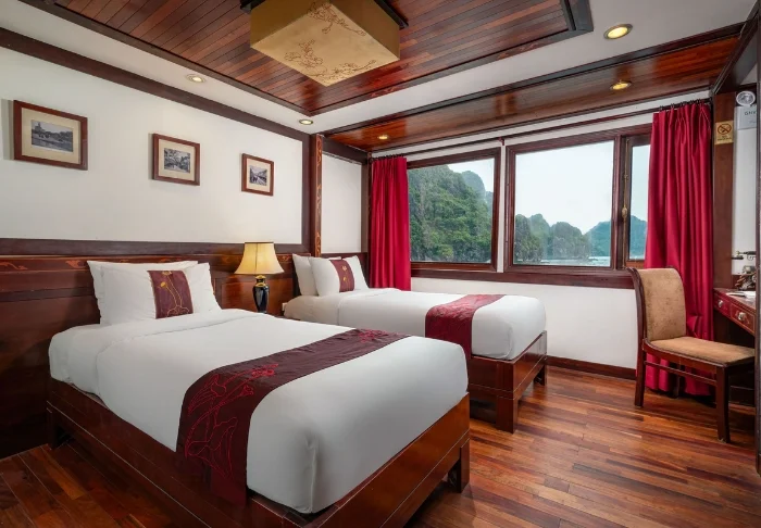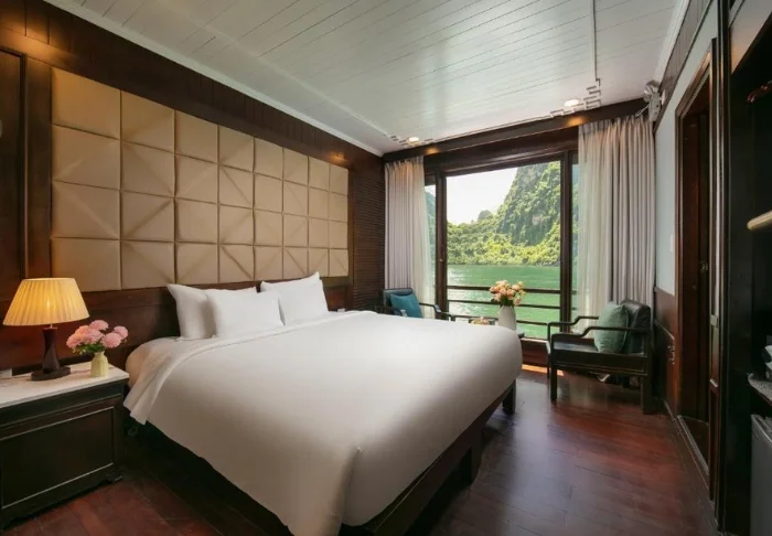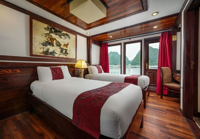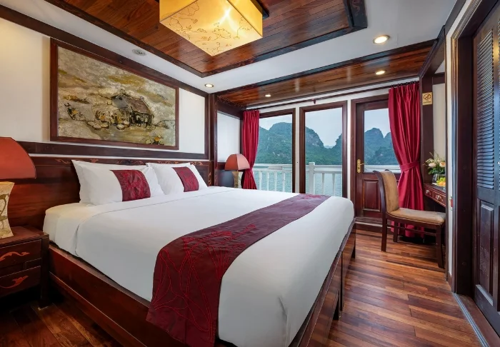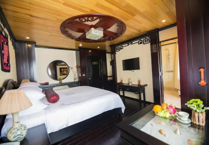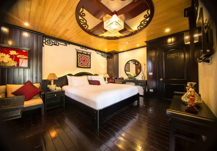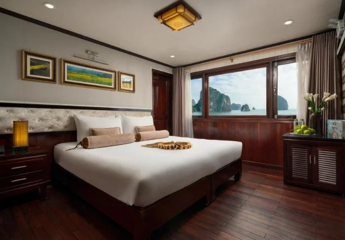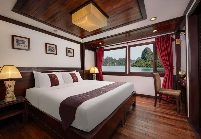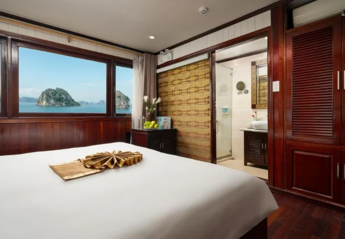 Das Schiff bietet 24 Kabinen auf zwei Decks, die vom traditionellen vietnamesischen Kunsthandwerk und der regionalen Kultur inspiriert sind. Die Kabinen sind mit edlem dunklen Holz, kunstvollen Details und großen Panoramafenstern mit Blick auf die Bucht gestaltet. Sie verfügen über Klimaanlage, Minibar, Safe, Tee- und Kaffeezubereitungsmöglichkeiten sowie ein Badezimmer mit Badewanne und separater Dusche. Die großzügigen Kabinen verbinden warme Materialien mit modernem Komfort und bieten Ihnen den idealen Rückzugsort zwischen den täglichen Erlebnissen.