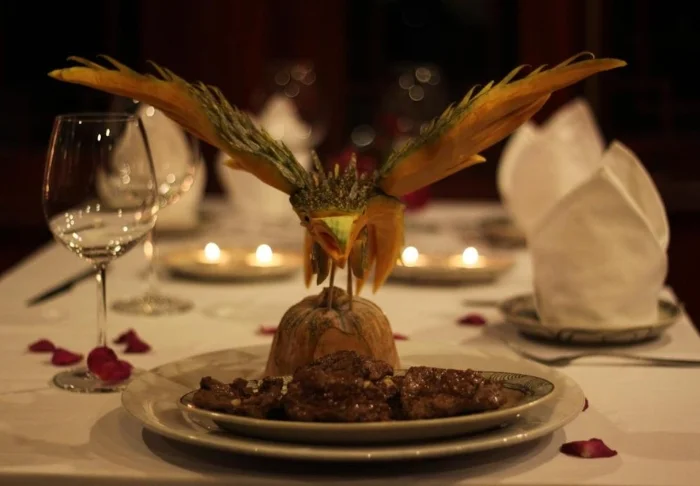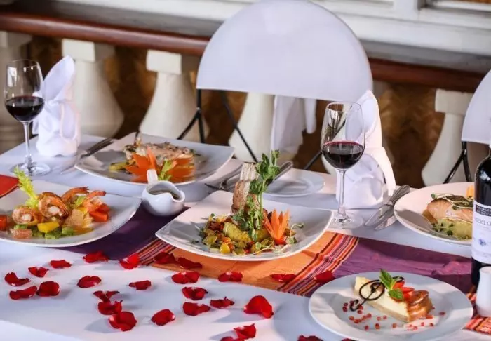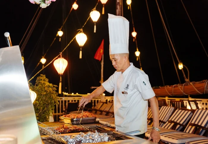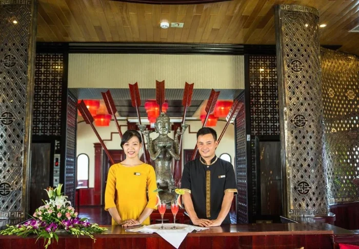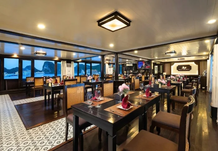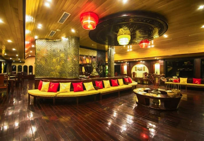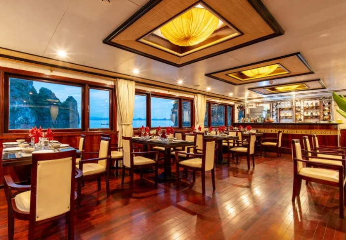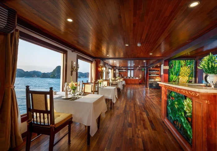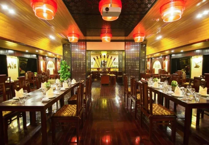 Im Bordrestaurant werden vietnamesische Speisen aus regionalen Zutaten mit exotischen Gewürzen angeboten. Die Holzeinrichtung des Speiseraums verbreitet eine angenehm romantische Atmosphäre.