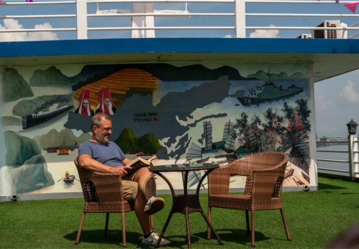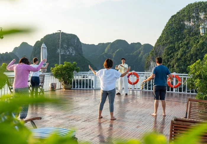 Direkt außerhalb der Kabine erwartet Sie das Sonnendeck mit Liegestühlen und Panoramablick auf die zahlreichen Felsformationen oder der Wellness-Bereich, in dem Sie Körper und Geist zur Ruhe kommen lassen können. Darüber hinaus bietet das Schiff Aktivitäten wie Kochkurse, Kajaktouren und Tai-Chi, sodass Sie Erholung und Erlebnisse optimal miteinander verbinden können.