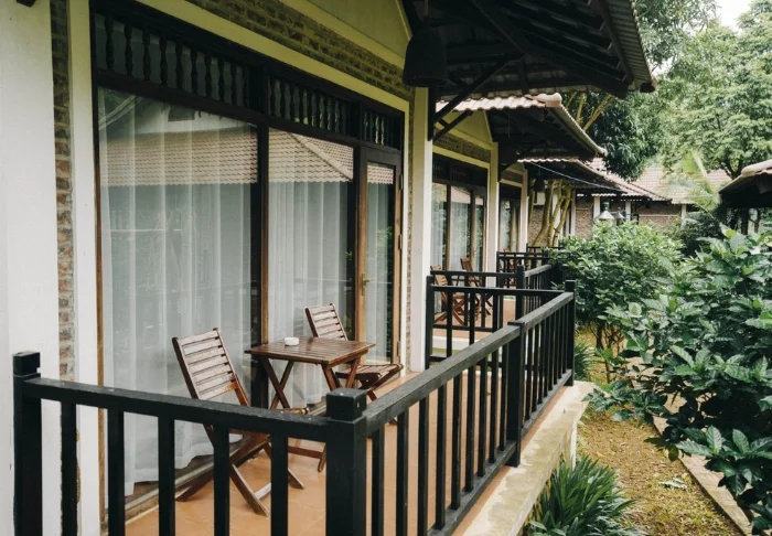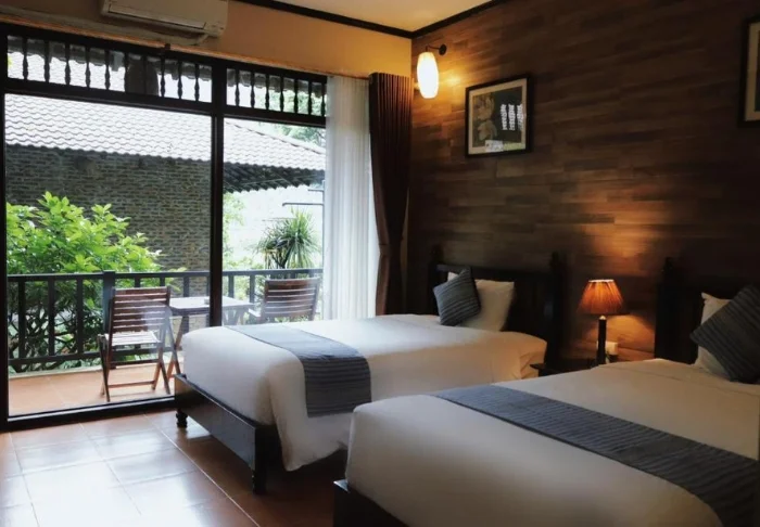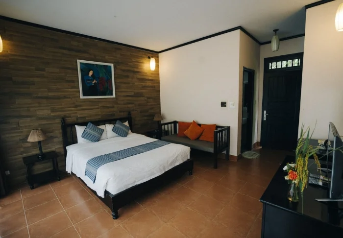Ihr Aufenthalt beinhaltet standardmäßig ein Superior-Zimmer mit heller, beruhigender Einrichtung in erdigen Tönen, die eine warme und entspannte Atmosphäre schafft. Große Fenster lassen viel Tageslicht herein und bieten einen schönen Blick auf die Umgebung. Zur Ausstattung des Zimmers gehören Klimaanlage, TV, WLAN, ein Wasserkocher sowie ein geräumiges Badezimmer samt Dusche. Darüber hinaus genießen Sie einen kleinen Balkon mit Ausblick auf den Garten oder den Fluss – ideal, um nach einem Tag voller Erlebnisse zu entspannen.