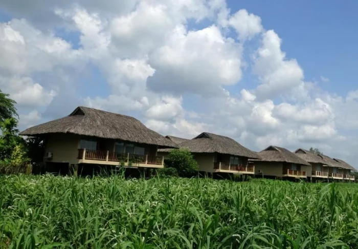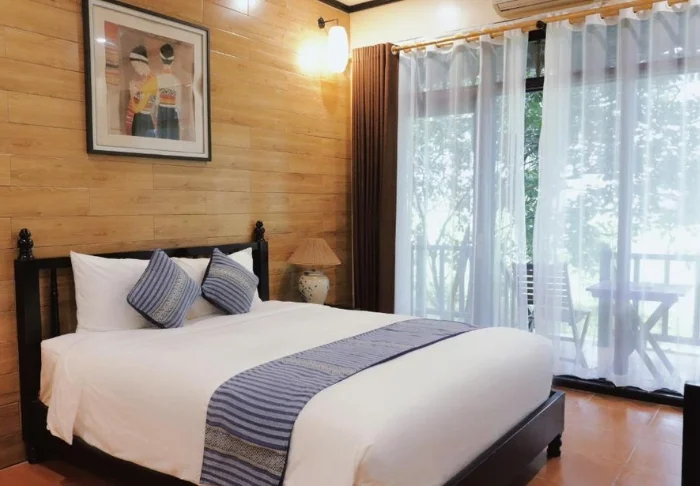 Standardmäßig wohnen Sie in einem Deluxe-Bungalow auf Pfählen. Die Einrichtung ist einfach gehalten, mit Fliesenboden, dunklen Holzmöbeln und herrlich großen Fenstern. Der Bungalow ist mit Klimaanlage, WLAN, TV, Minibar, Safe und Wasserkocher ausgestattet. Das Badezimmer ist mit einer Dusche und einem Föhn ausgestattet. Von Ihrem privaten Balkon können Sie bei einer Tasse Tee oder Kaffee die Aussicht auf Reisfelder und Berge genießen.
