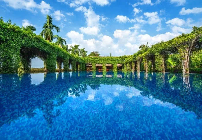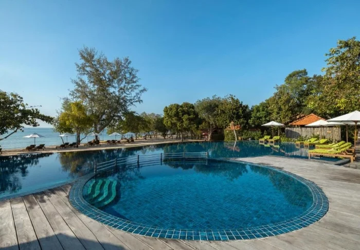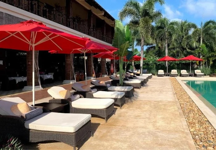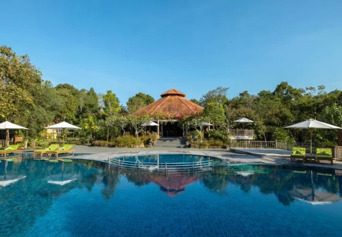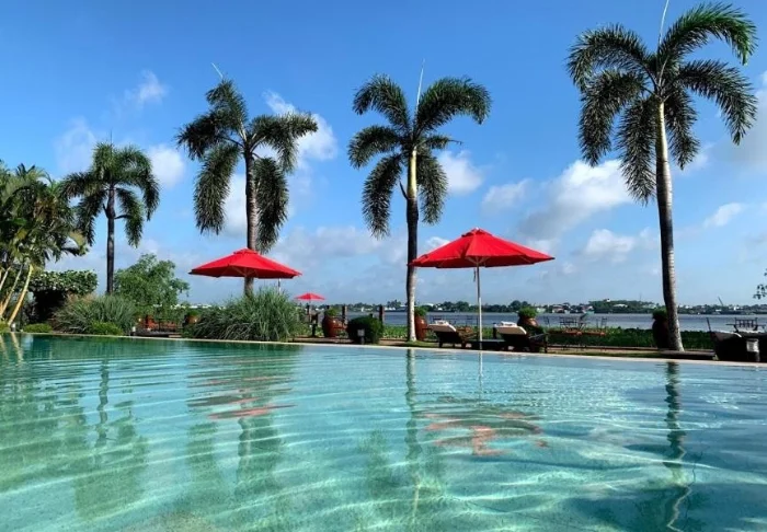 Der Pool des Resorts bietet Ausblick auf den Fluss und ist mit Liegestühlen und Sonnenschirmen ausgestattet. Im Oasis Spa können Sie entspannende Behandlungen genießen, umgeben von Lotusteichen und Obstbäumen.