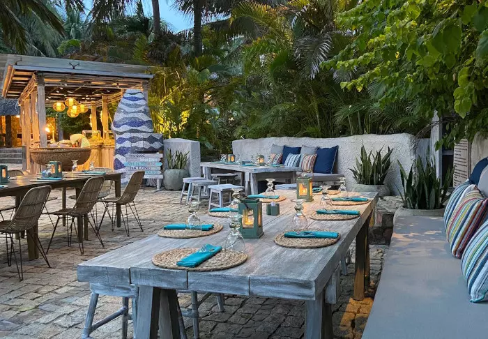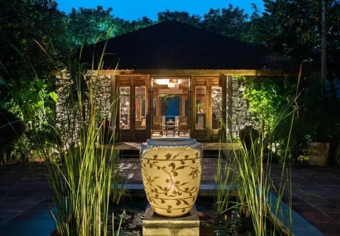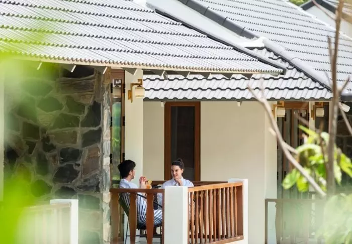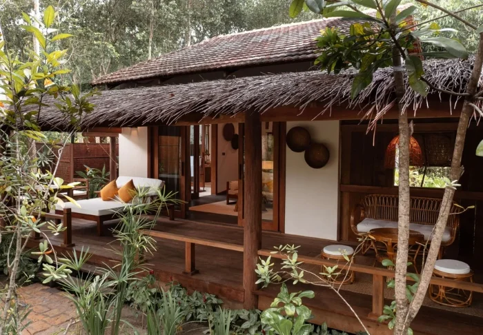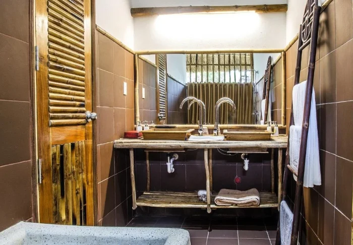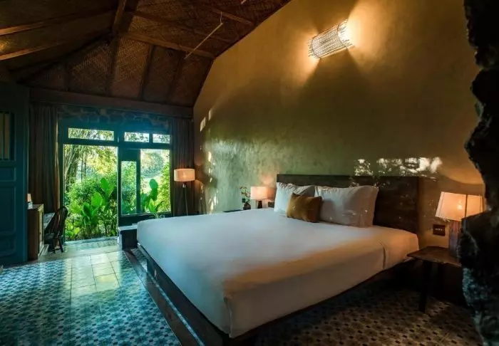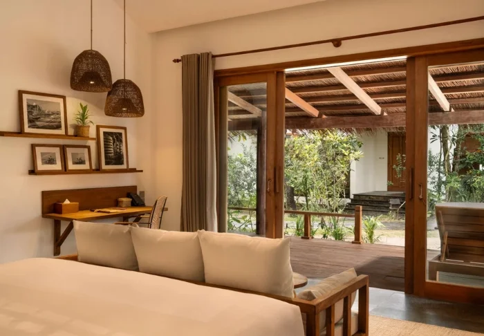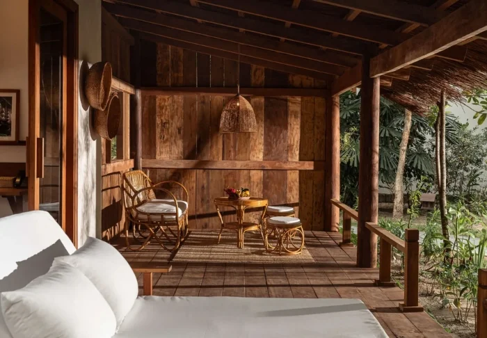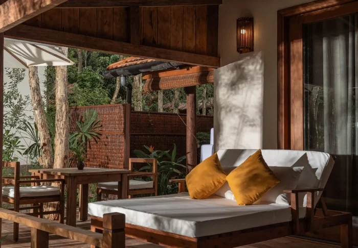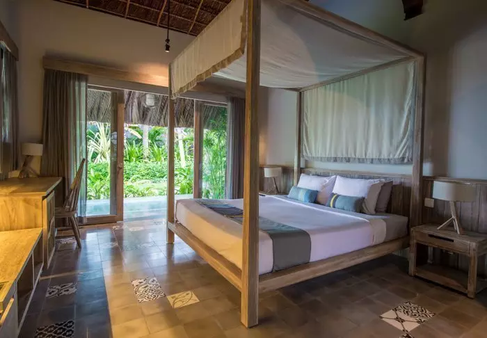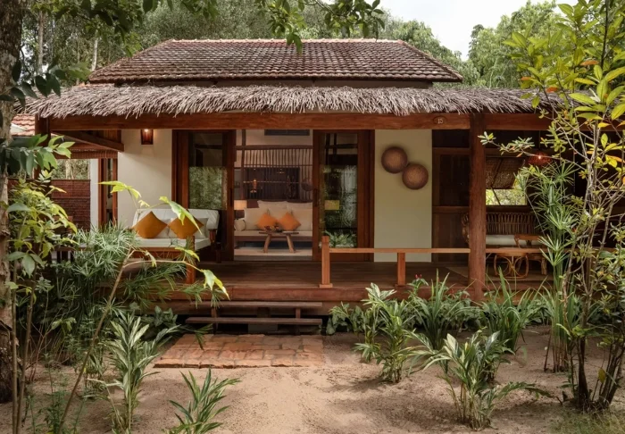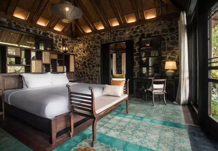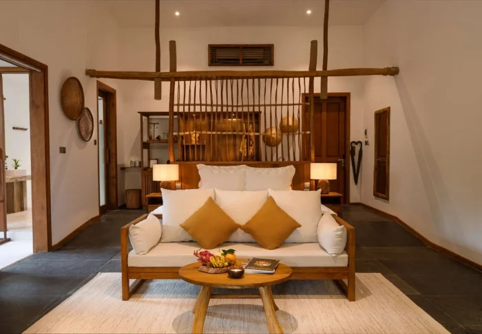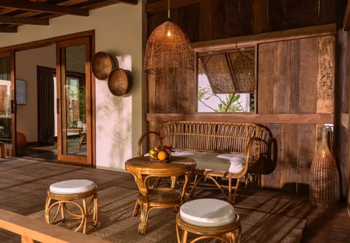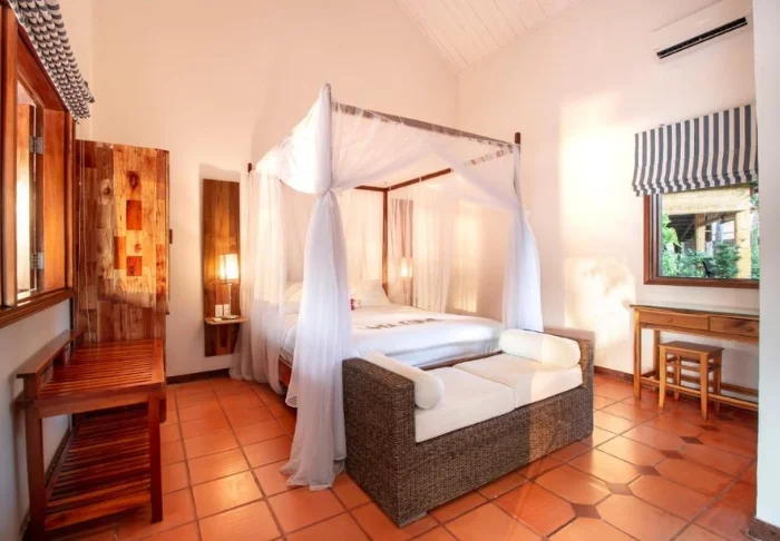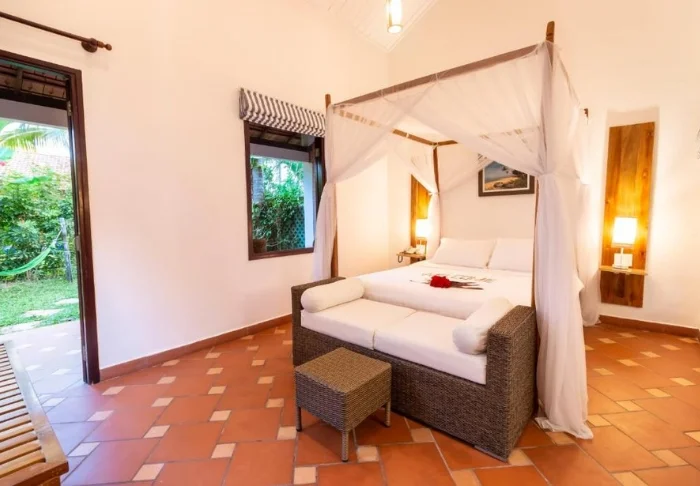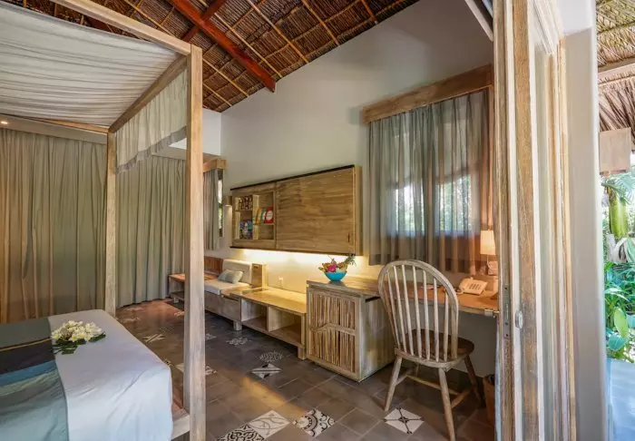 Jeder der 19 Bungalows des Resorts ist in zwei luxuriöse und geräumige Zimmer unterteilt und bietet ein eigenes Badezimmer sowie eine Terrasse mit Aussicht auf den Garten. Die Zimmer sind geschmackvoll mit regionalen Holzsorten, Stein, Keramik und Fliesen mit traditionellen Mustern eingerichtet, was dem Zimmer Raffinesse und Charme verleiht.