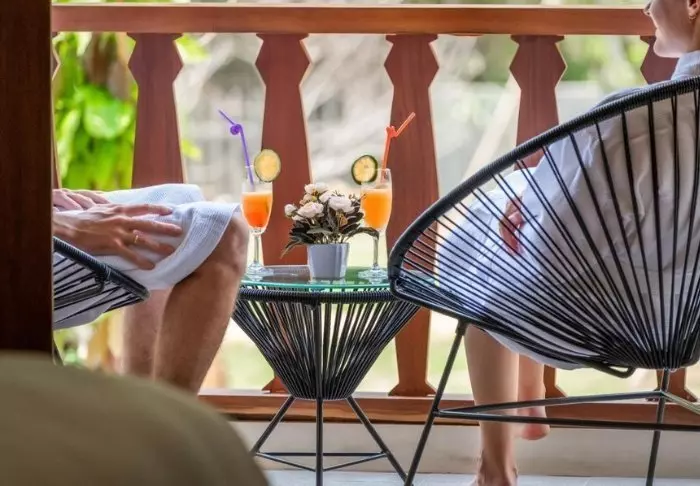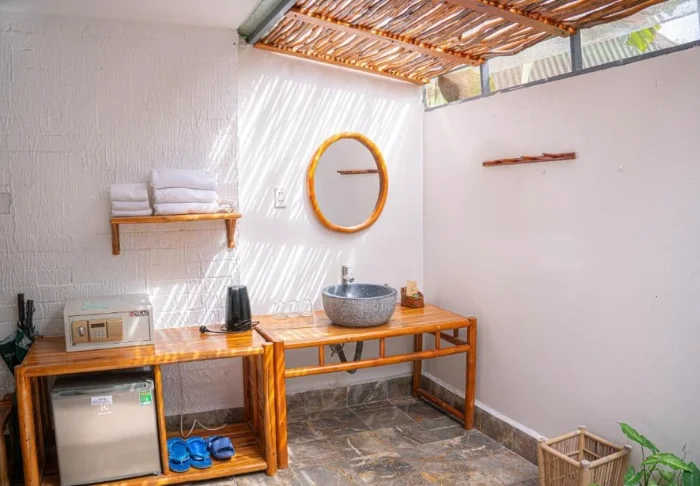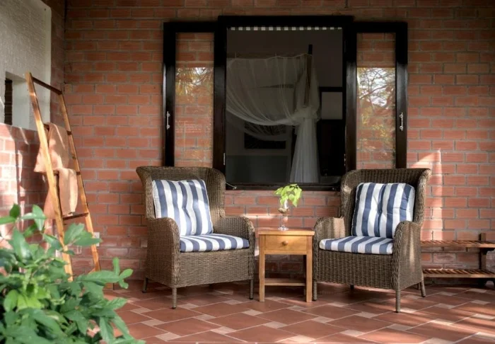 Auch in den mindestens 70 m² großen, geräumigen Zimmern setzt sich das natürliche wunderschön rustikale Design fort. Die Zimmer sind alle mit WLAN, Klimaanlage, Deckenventilator, Safe und einem herrlich großen Badezimmer mit Föhn, Bademantel, Dusche und Badewanne ausgestattet. Von der Terrasse aus können Sie die Ruhe und die grüne Umgebung genießen.