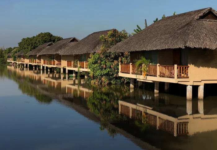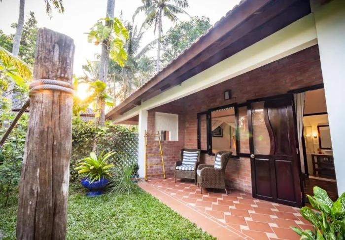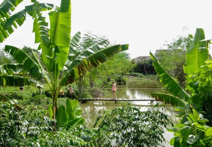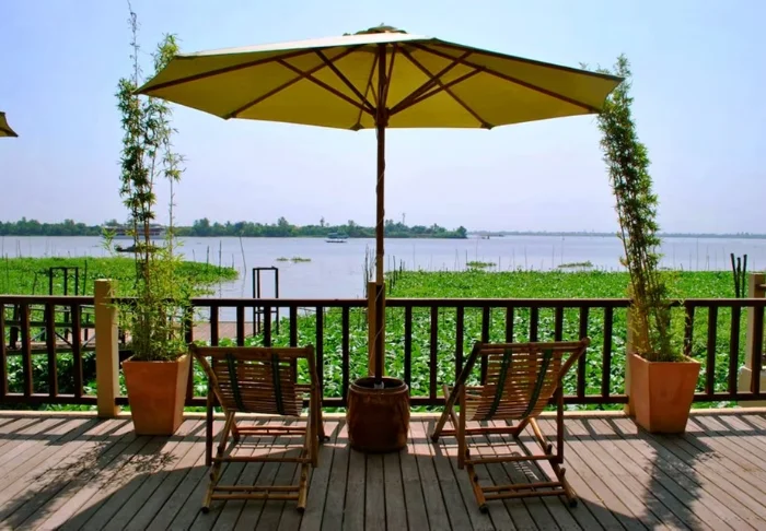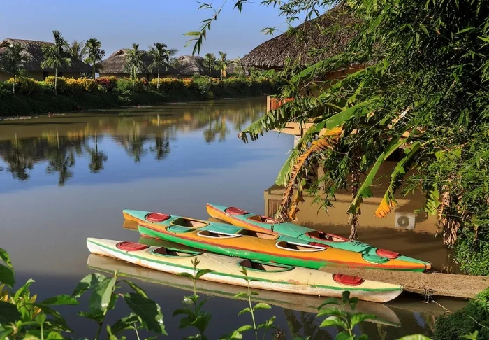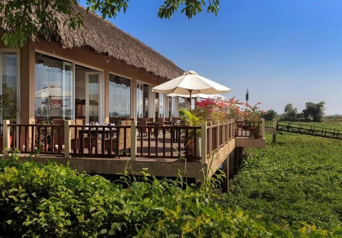 Die Anlage besticht durch einen wunderschönen Garten mit üppigen Palmen und farbenfrohen Blumen sowie einen Außenpool, in dem Sie schwimmen oder im schattigen Bereich entspannen und dabei den Blick auf den Fluss genießen können. Wenn Sie die Gegend erkunden möchten, bietet das Resort einen Fahrradverleih an und hilft Ihnen gerne bei der Organisation von Ausflügen durch das verzweigte Wasserstraßennetz des Deltas.