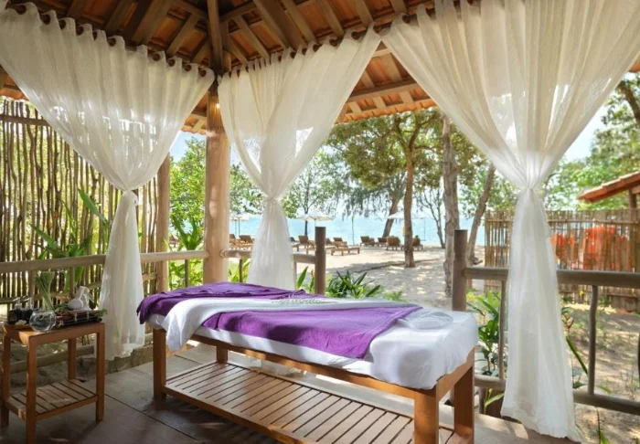 Nach einem herrlichen Tag in der Sonne können Sie sich mit einer entspannenden Anwendung im Wellnessbereich verwöhnen lassen, der aus kleinen Pavillons mit Sichtschutz besteht.