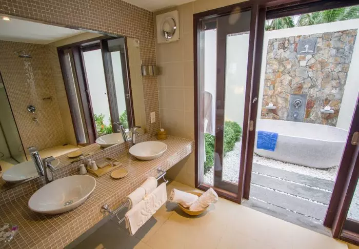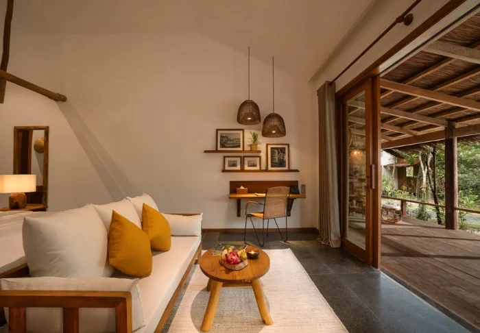 Die Zimmer sind geschmackvoll mit einer Kombination aus Naturfarben mit einzelnen Kontrastfarben auf Polstern, Teppichen usw. eingerichtet. Die Badezimmer besitzen teilweise eine offene Decke, sodass sie die Brise spüren und das Meer riechen. Alle Zimmer sind mit Klimaanlage, Minibar, Tee- und Kaffee-Ecke, Safe, WLAN, Flachbildschirm-TV-Gerät, Moskitonetz und eigener Veranda ausgestattet.