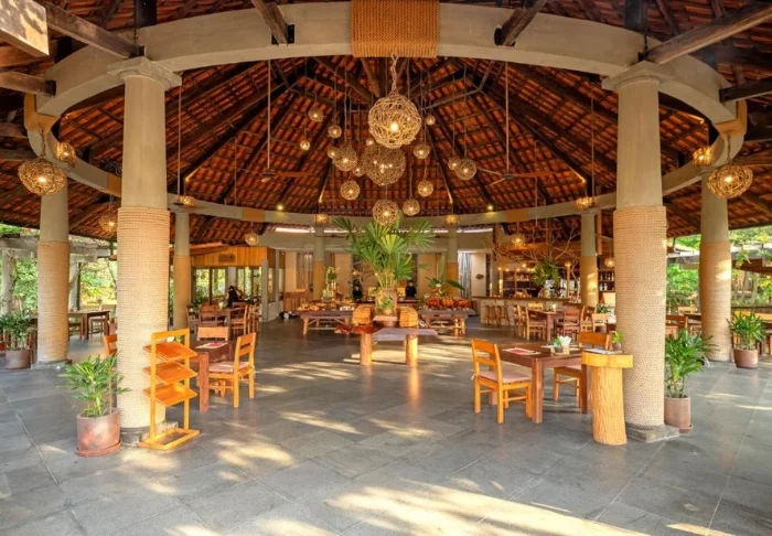 Im Resort gibt es 3 Restaurants. Das Hauptrestaurant Green Bay Restaurant ist ein Outdoor-Restaurant, in dem den ganzen Tag über Gerichte aus dem Osten und Westen sowie leckere Fisch- und Meeresfrüchtegerichte serviert werden. Auch das üppige Frühstücksbuffet wird hier serviert. Das Coral Bay Restaurant liegt direkt am Wasser. Dort erhalten Sie Snacks und kleine gesunde Gerichte aus regionalen Rohwaren. Hier können Sie außerdem den Sonnenuntergang bei einem „Sundowner“-Getränk auf der Veranda genießen. Bei den Abendmenüs liegt der Schwerpunkt auf der vietnamesischen Küche. Direkt am Wasser liegt das Rock Bay Restaurant und serviert hauptsächlich Fisch, Meeresfrüchte, globale Gerichte und Cocktails. Alle Restaurants bereiten die Speisen aus Bio-Zutaten, darunter auch Gewürzen und Gemüse aus dem eigenen Garten, zu.